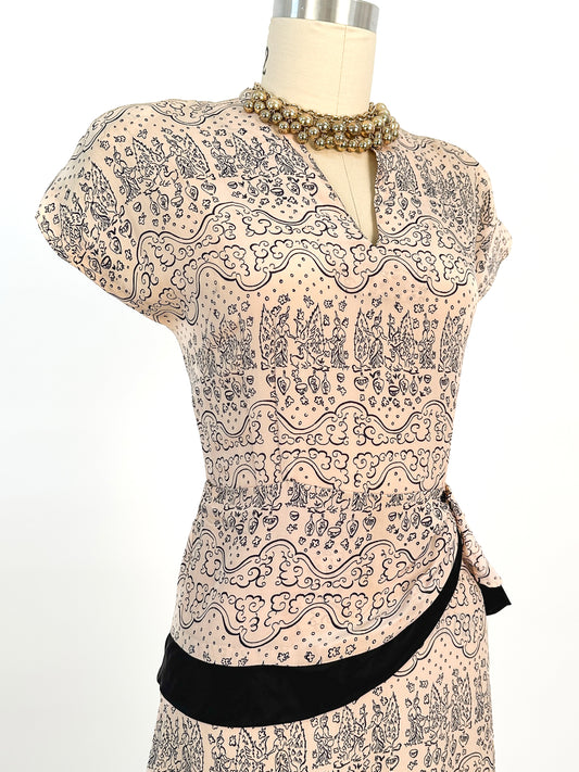 40s Silk Wiggle Dress with Water Nymph Novelty Print / Waist 26