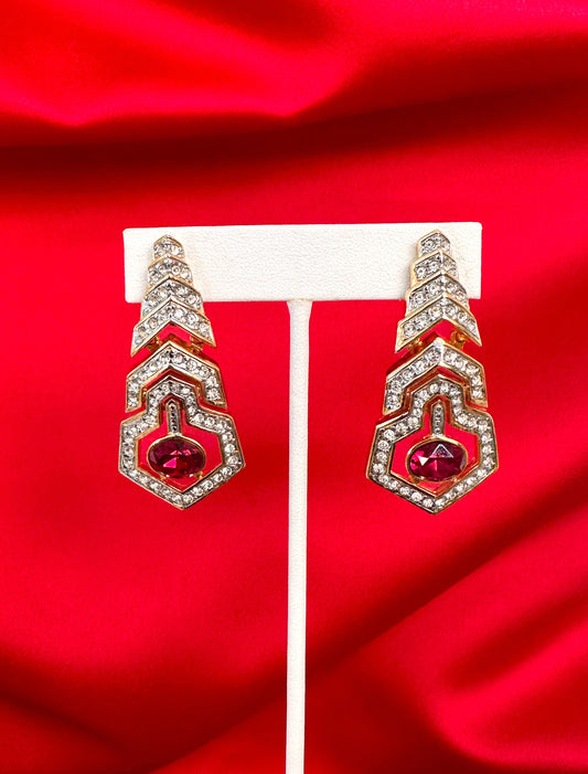 1970s Gold Art Deco Inspired Ruby and Clear Rhinestone Clip-ons
