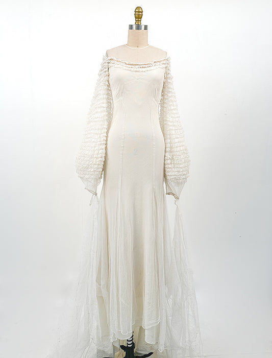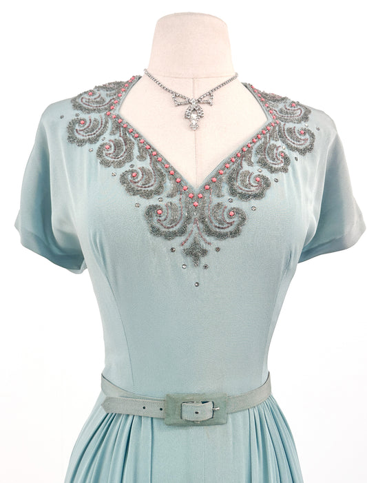 1940s Sea Foam Crepe Gown with Beaded Neckline / Waist 28
