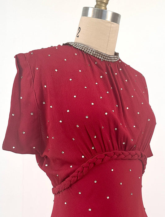 1940s Crimson Red Crepe Gown with Rhinestone Accents / Waist 26