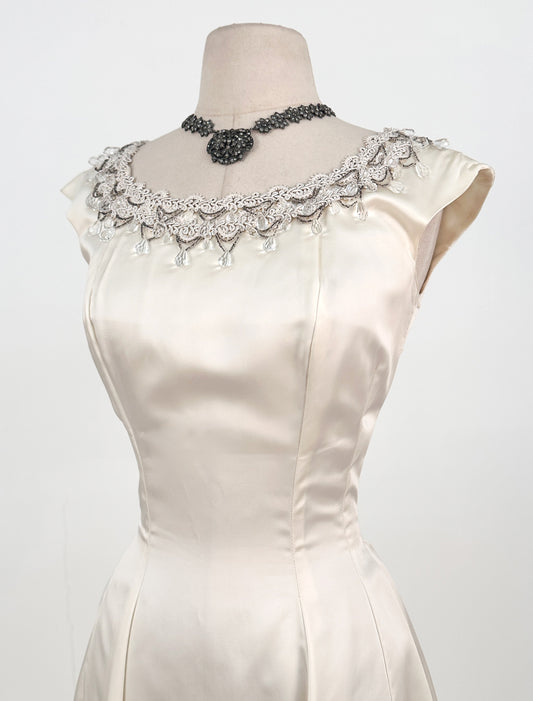 1960s White Satin Wedding Gown with Beaded Neckline / Waist 28"