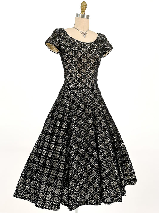 1950s Black Floral Lace Fit & Flare / Waist 26.5