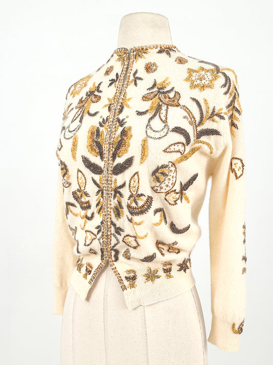 1950s Cream Autumnal Beaded Angora Sweater / Medium