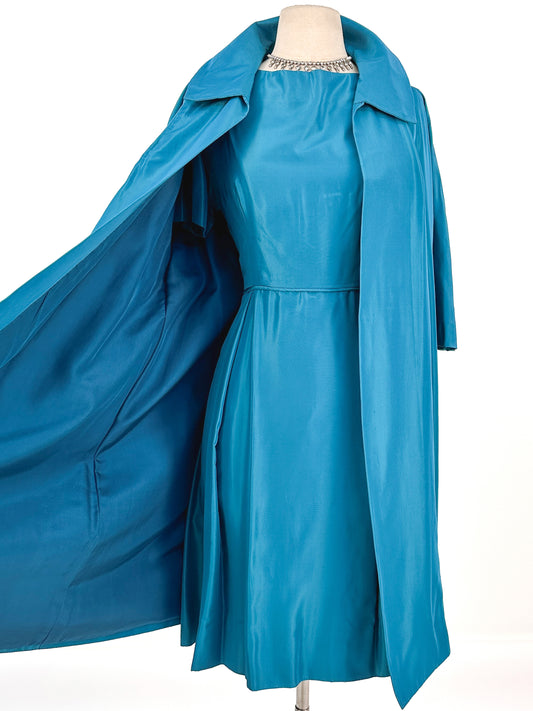 1950s Deep Aqua Satin Dress with Matching Swing Coat / Waist 30