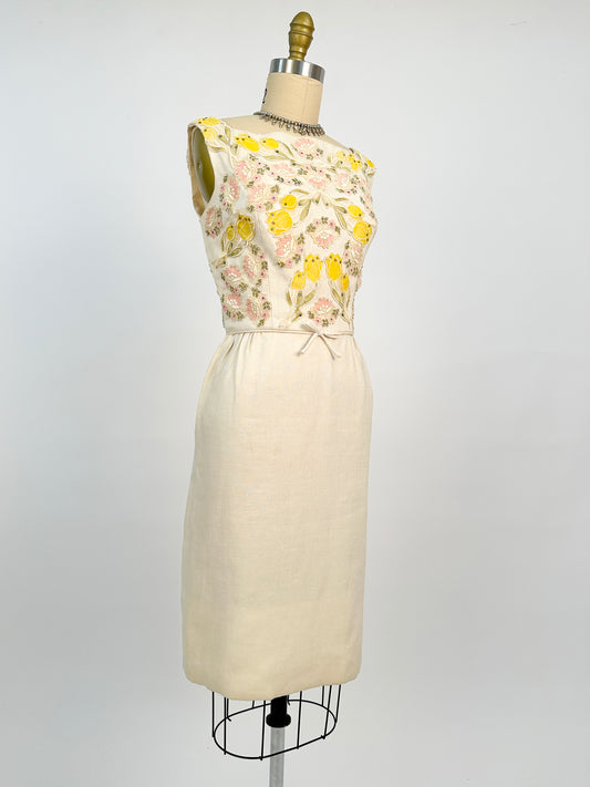 1950s Cream Linen Dress with Rhinestones and Floral Appliqués / Waist 28