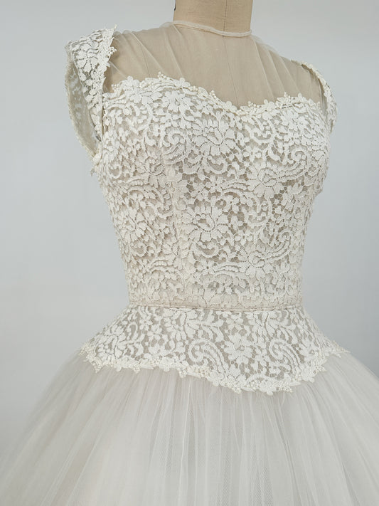 1950s Tea Length Lace and Tull Wedding Dress / Waist 24