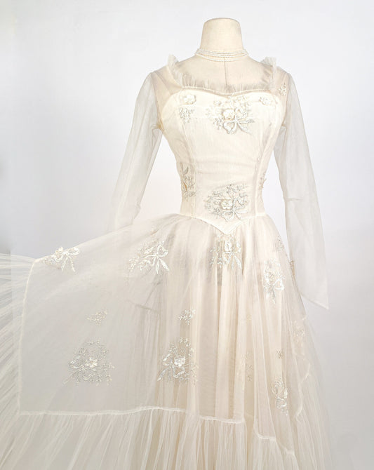 Dreamy 1950s Tulle Wedding Gown with Embroidered Bows and Flowers / Waist 26