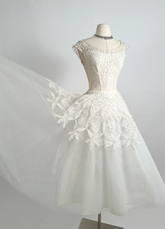 Darling 1950s Lace and Tulle Tea Length Wedding Gown / Waist 24