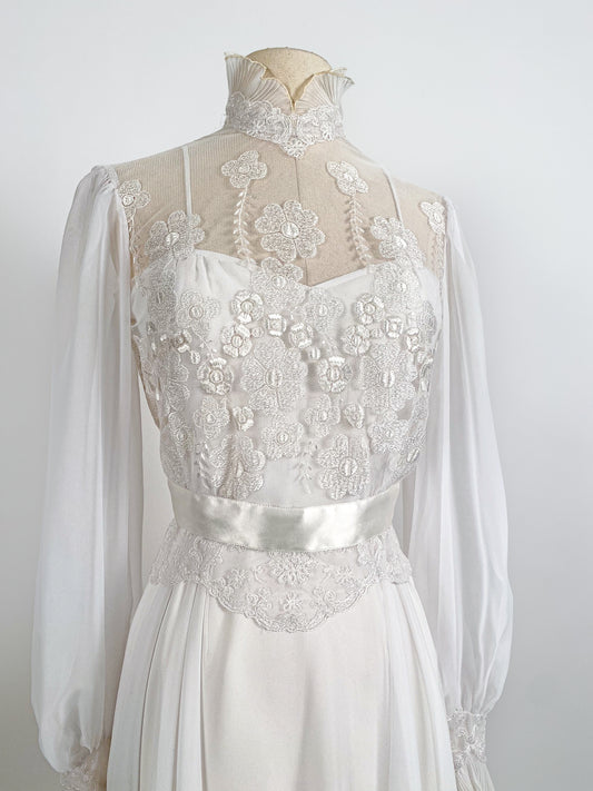 1970s Lace and Chiffon Wedding Dress / Waist 26