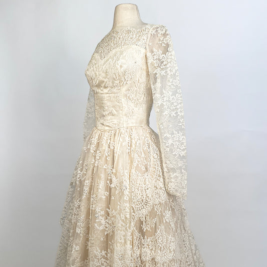 Stunning 1950s Chantilly Lace Tiered Wedding Gown / Waist 26
