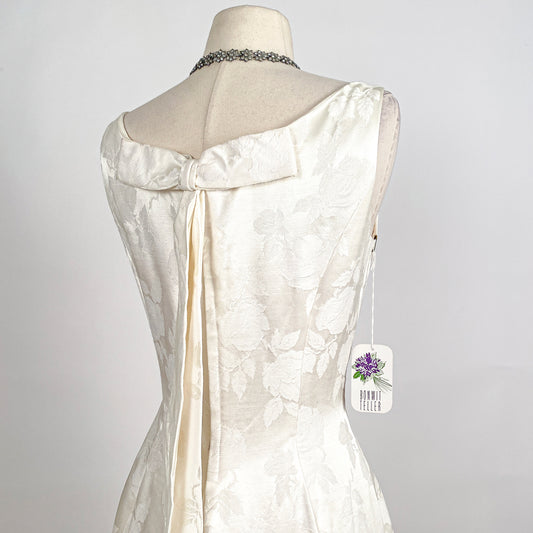 1960s Lovely White Damask Wedding Dress with Roses and Bow / Waist