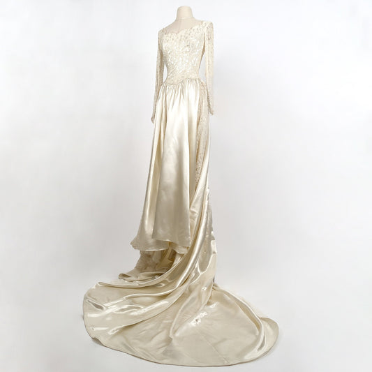 1940 Candlelight Satin Wedding Gown with Lace Bodice & Side Panels / Waist 28