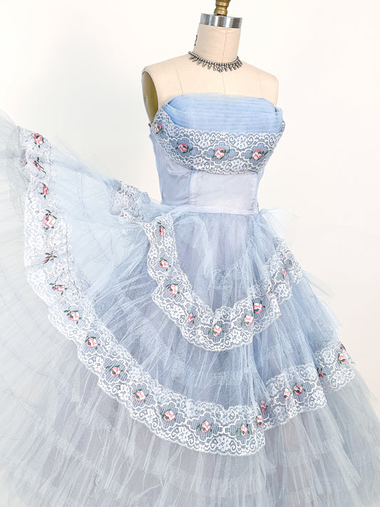 1950s Dreamy Pale Blue Tulle Party Dress / Waist 26