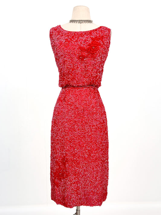 RARE 1950-60s Ruby Red Sequin Dress with Beaded Florals / Waist 30