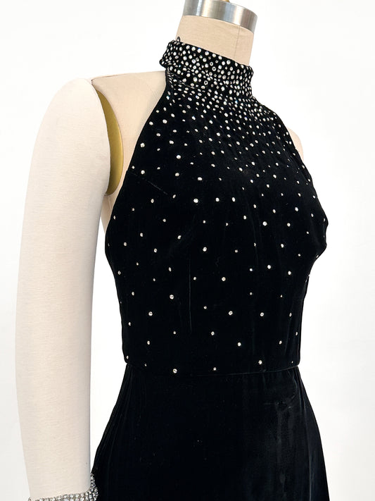 1960s Velvet Halter Gown with Rhinestone / Waist 26