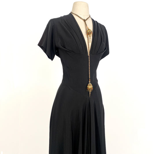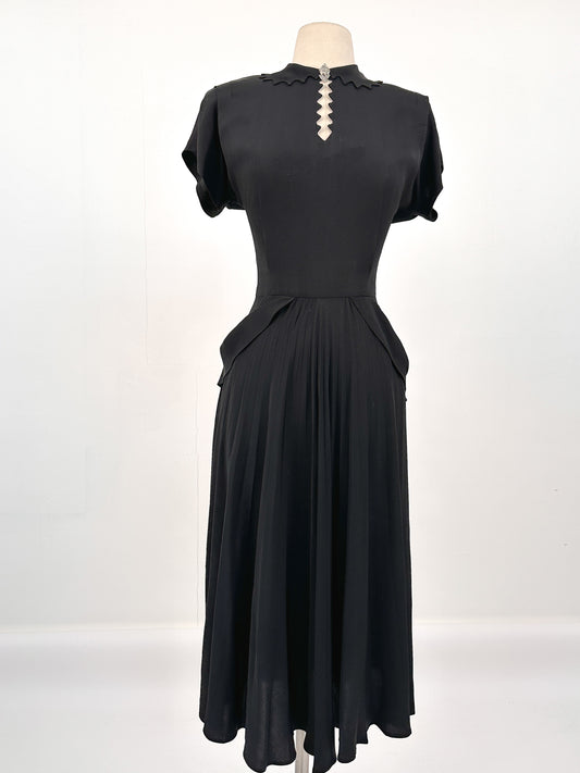 Dramatic 1940s Black Crepe Dress with Daring Neckline / Waist 26