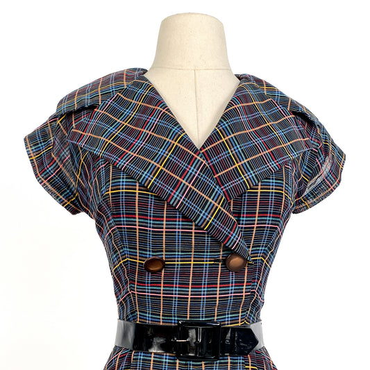 1950s Multi-Colored Plaid Cotton Dress / Waist 26