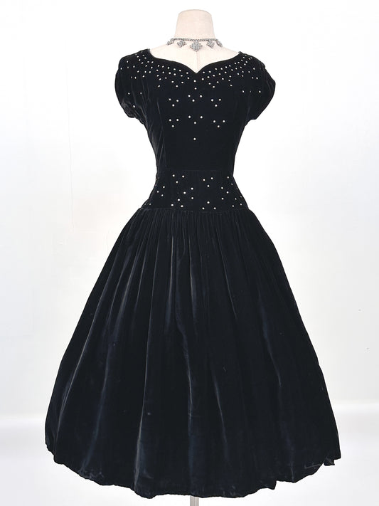 Early 1940s Black Velvet Party Dress with Rhinestones / Waist 28