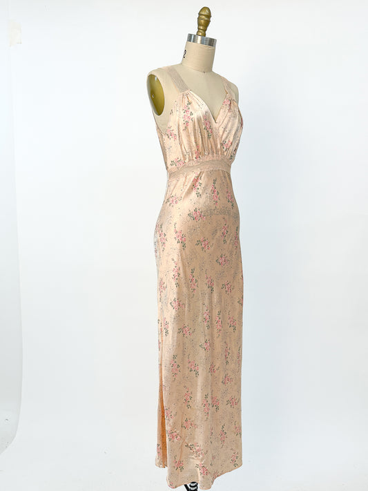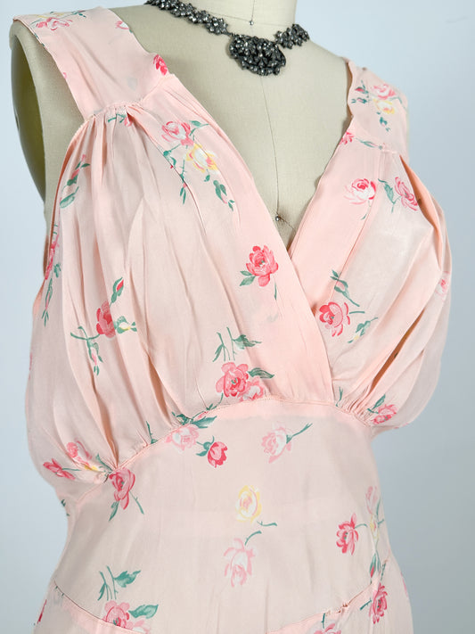 1930–40s Pale Pink Nightgown with Falling Petite Roses / Waist 32