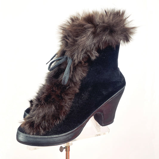 RARE 1940s Fur Trimmed Black Velvet Galoshes or Over Shoes / Size 5.5