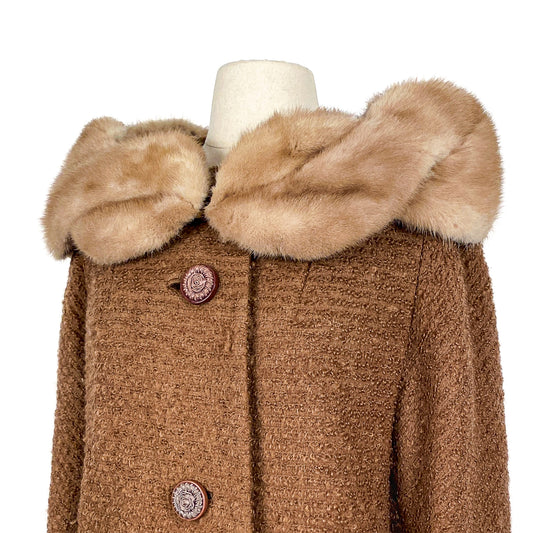 1950s Brown Curly Wool Coat with Fur Trim / Waist 44