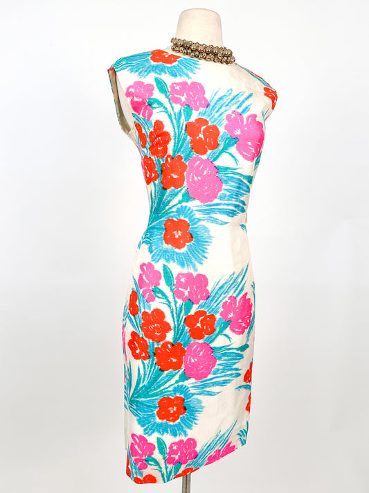 1960s Bright Tropical Floral Silk Wiggle Dress / Waist 32
