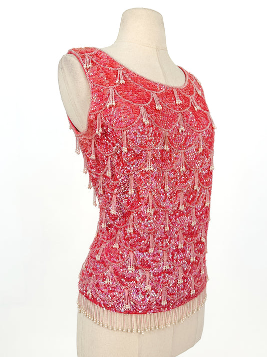 1960s Sparkling Fuchsia Sequin & Beaded Hot Pink Top / Bust 38