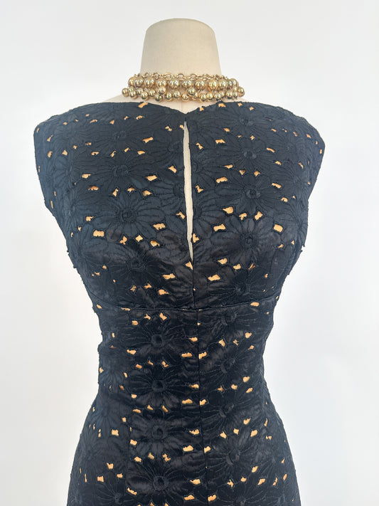 1960s Floral Die-Cut Satin Little Black Dress / Waist 28