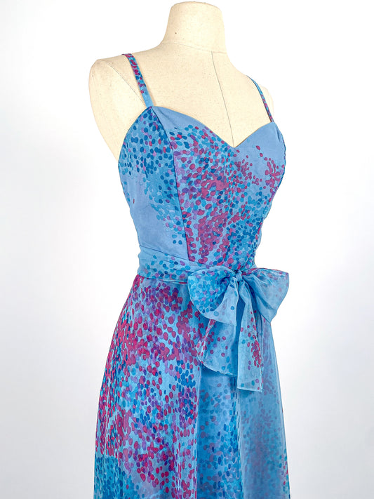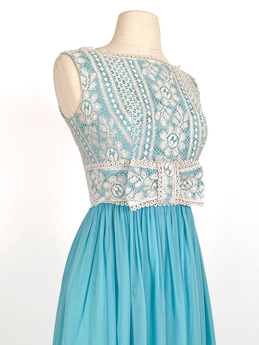 1960s Aqua Chiffon Dress with Lace Bodice / Waist 24