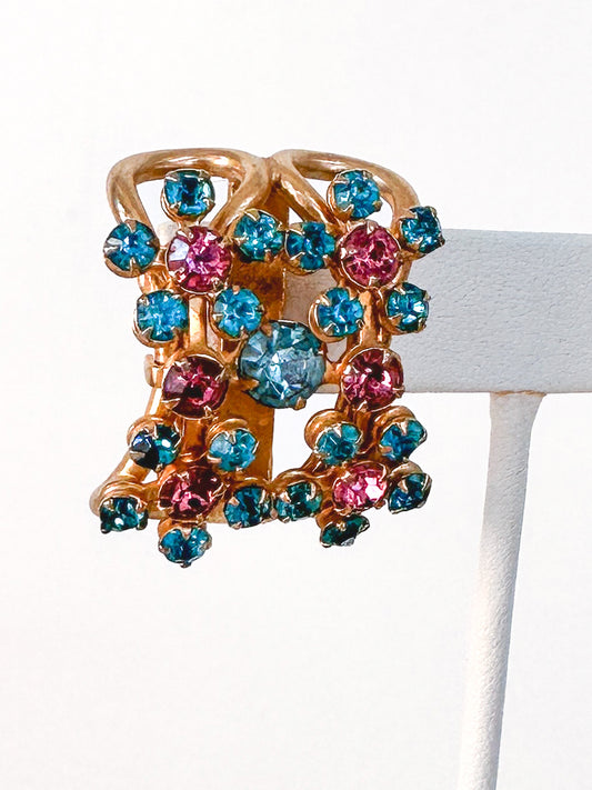 1960s Blue & Pink Rhinestone Gold Toned Statement Earrings