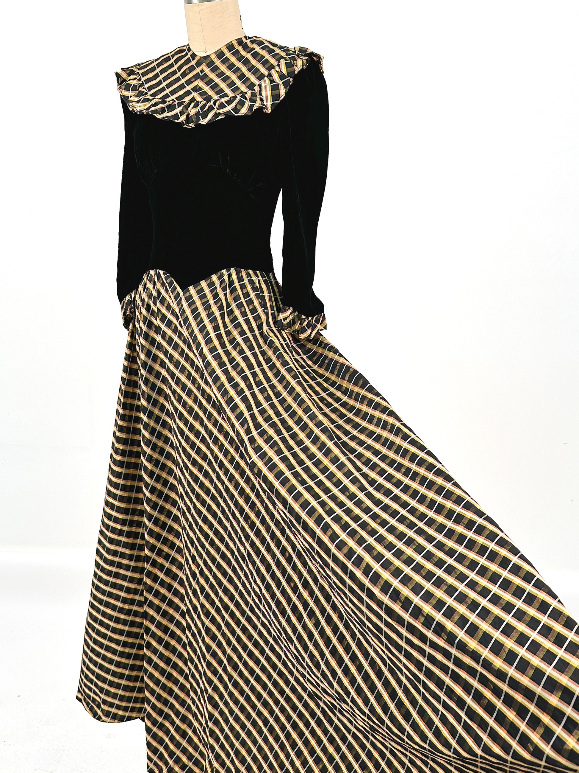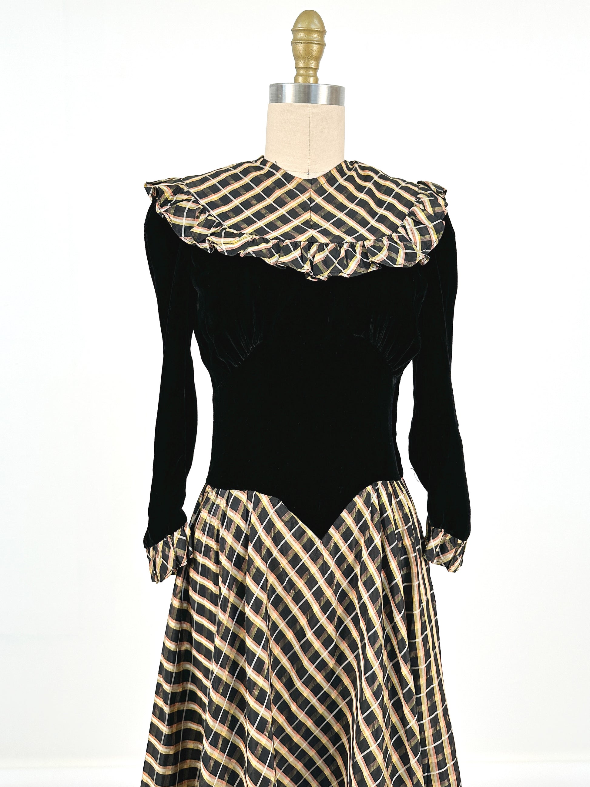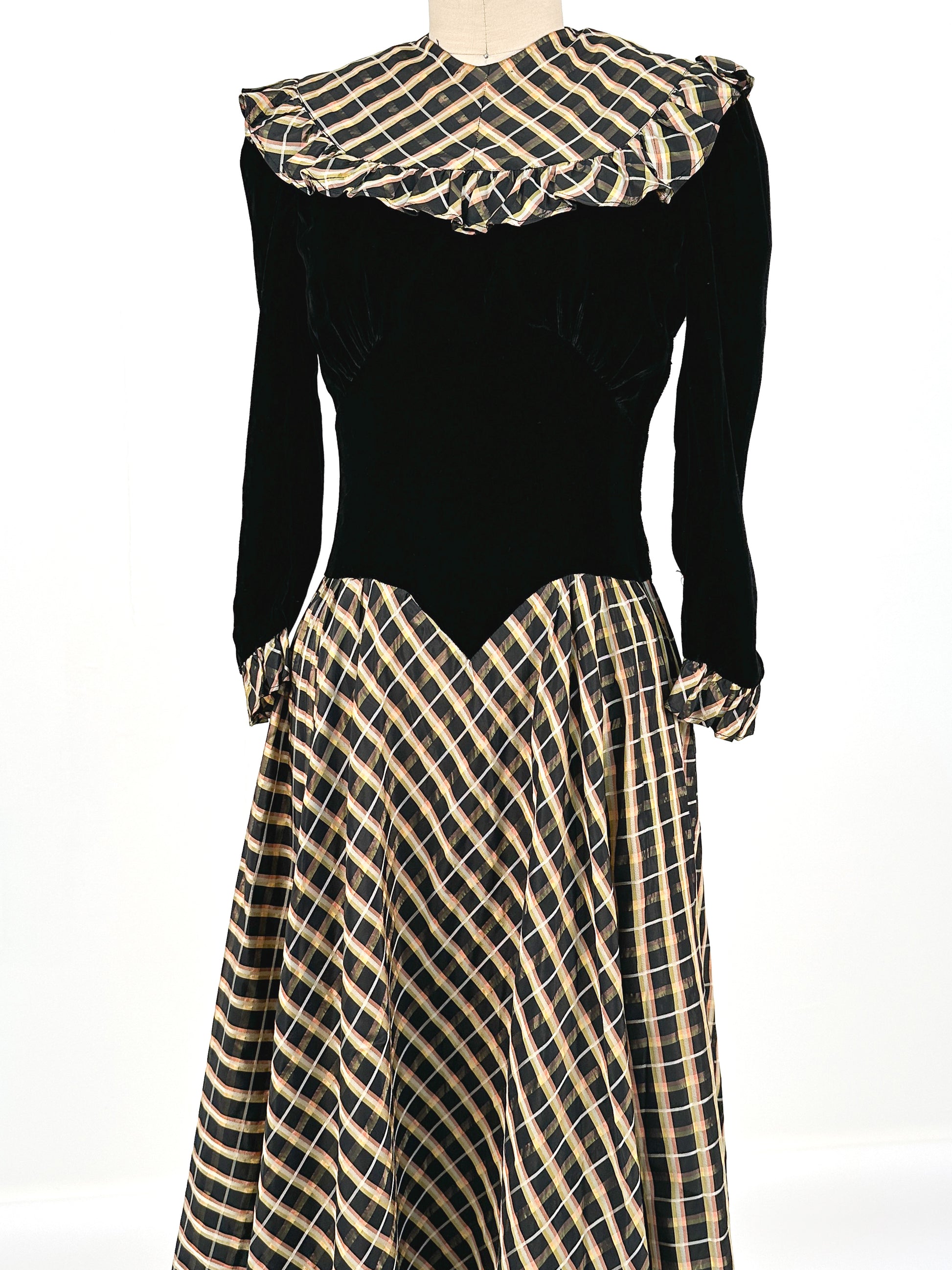 1940s Black Velvet and Plaid Taffeta Gown / Waist 24