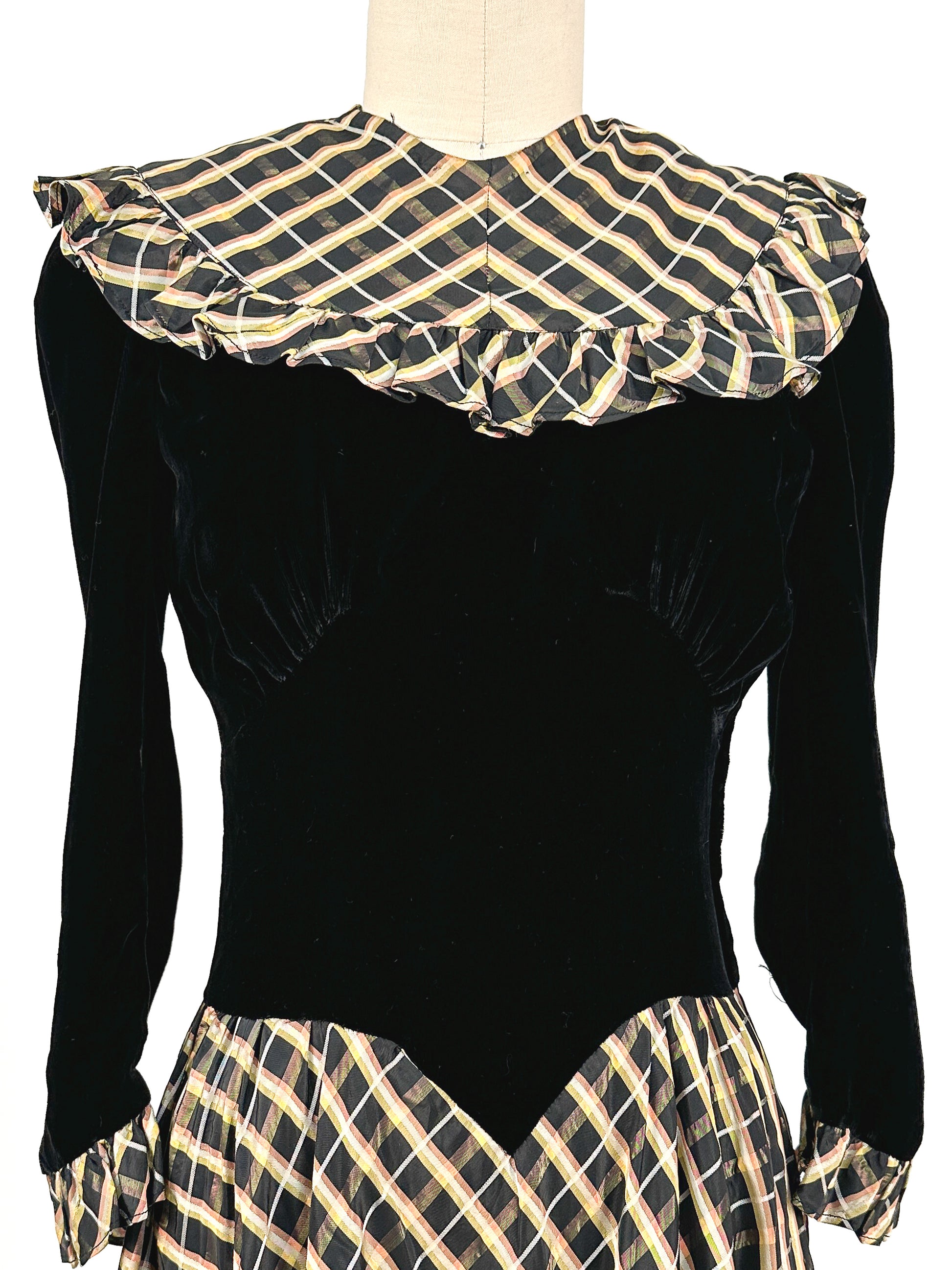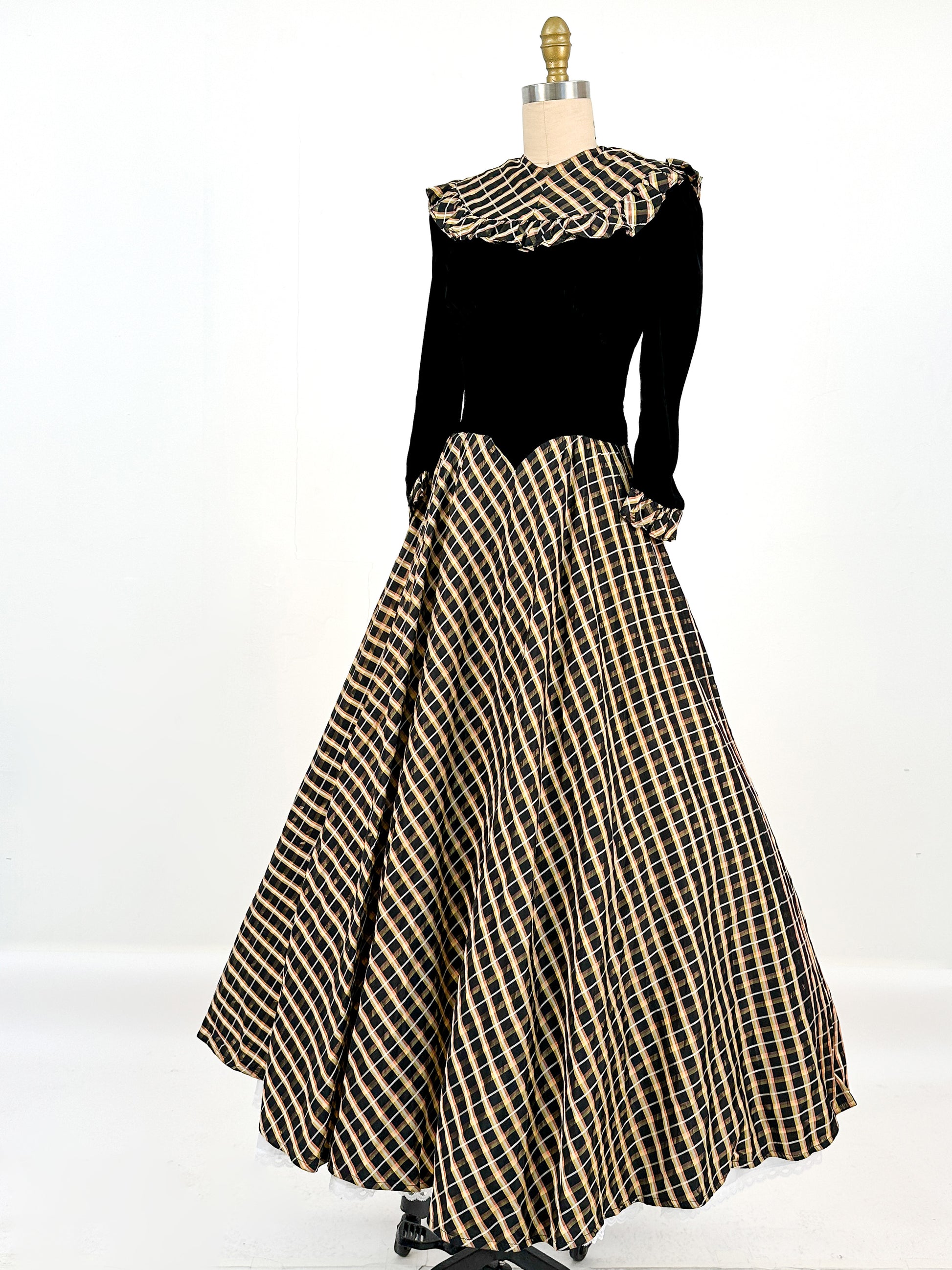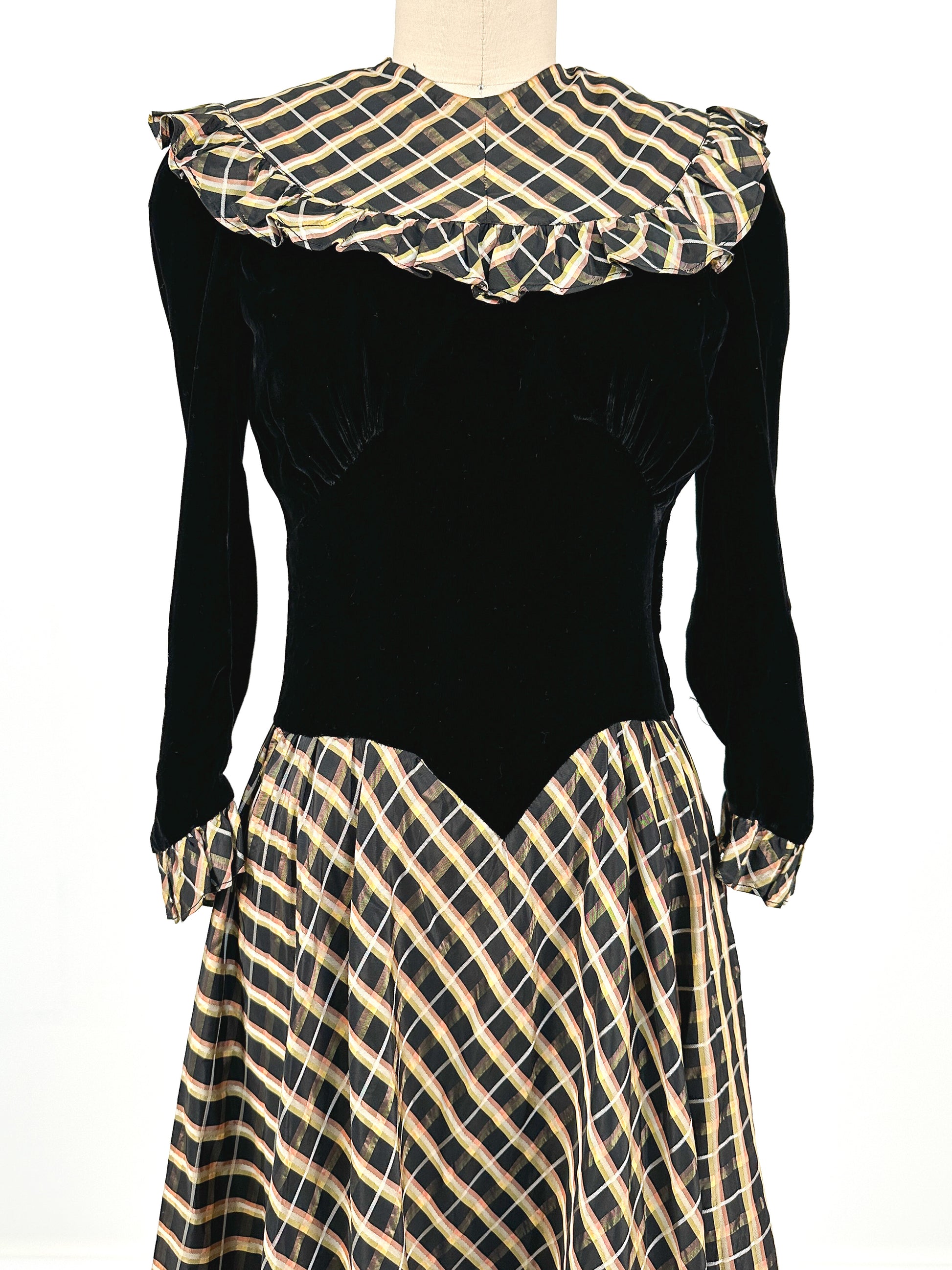 1940s Black Velvet and Plaid Taffeta Gown / Waist 24