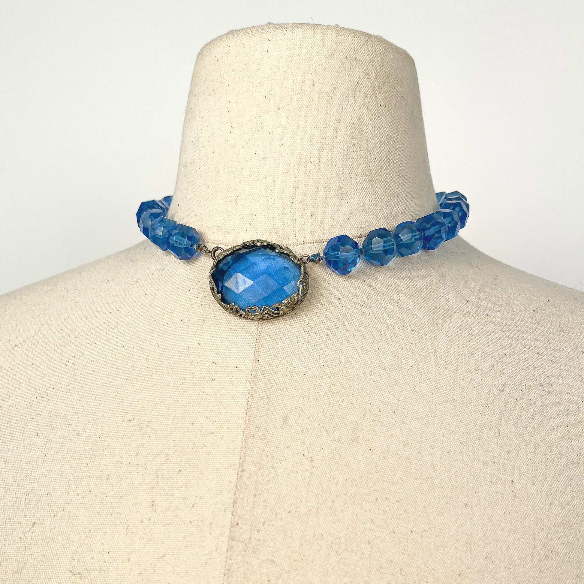 1930s blue glass choker with hand knotted fasted beads. The metal setting around the blue pendant features different sea creatures (crabs and fish). The claw clasp is located in the front next to the pendant.