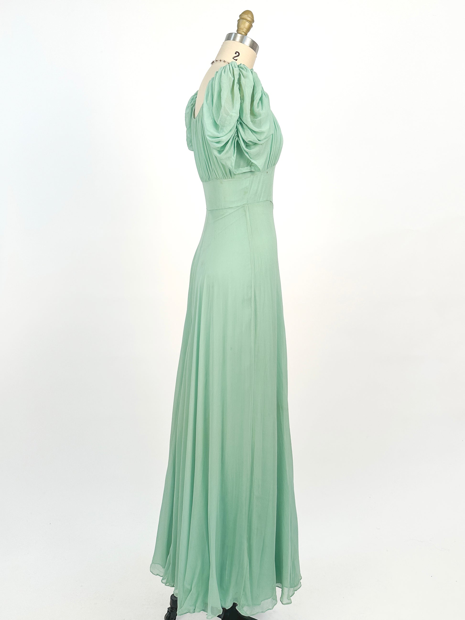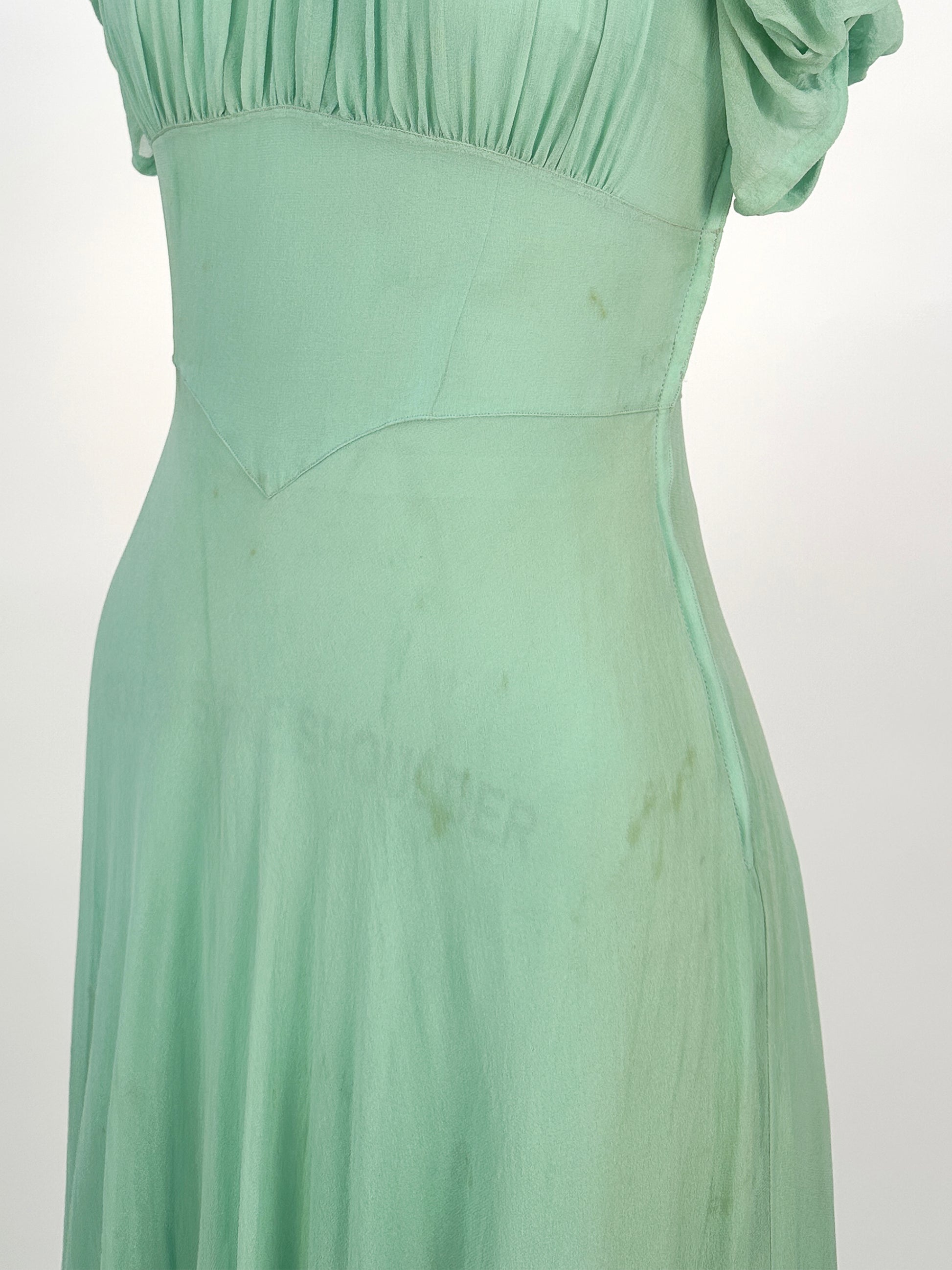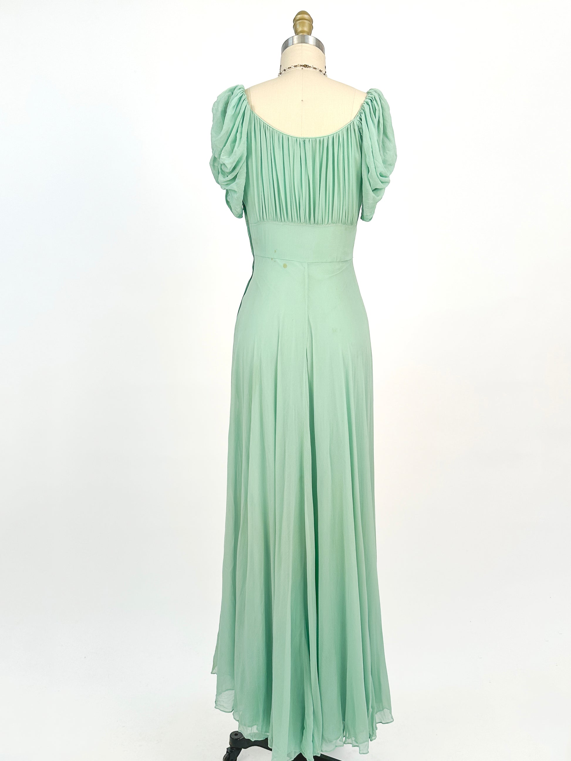 This 1930s sea-foam green silk chiffon gown features a bias-cut silhouette. Its flattering wide empire waistband, ruched bodice and puffed sleeves a complete the elegant look. Metal zipper closure. Please note the condition -- this dress is still a stunner.