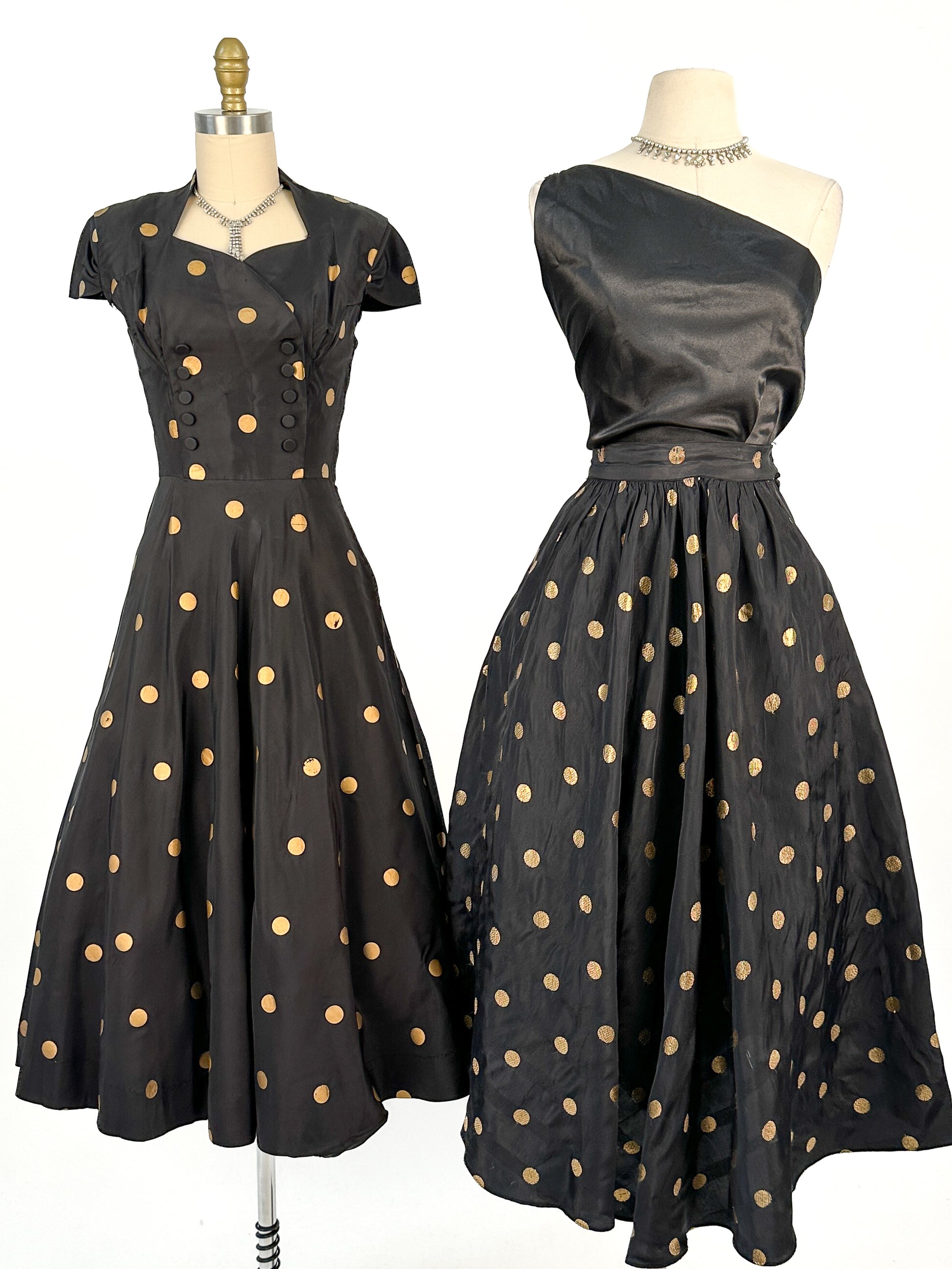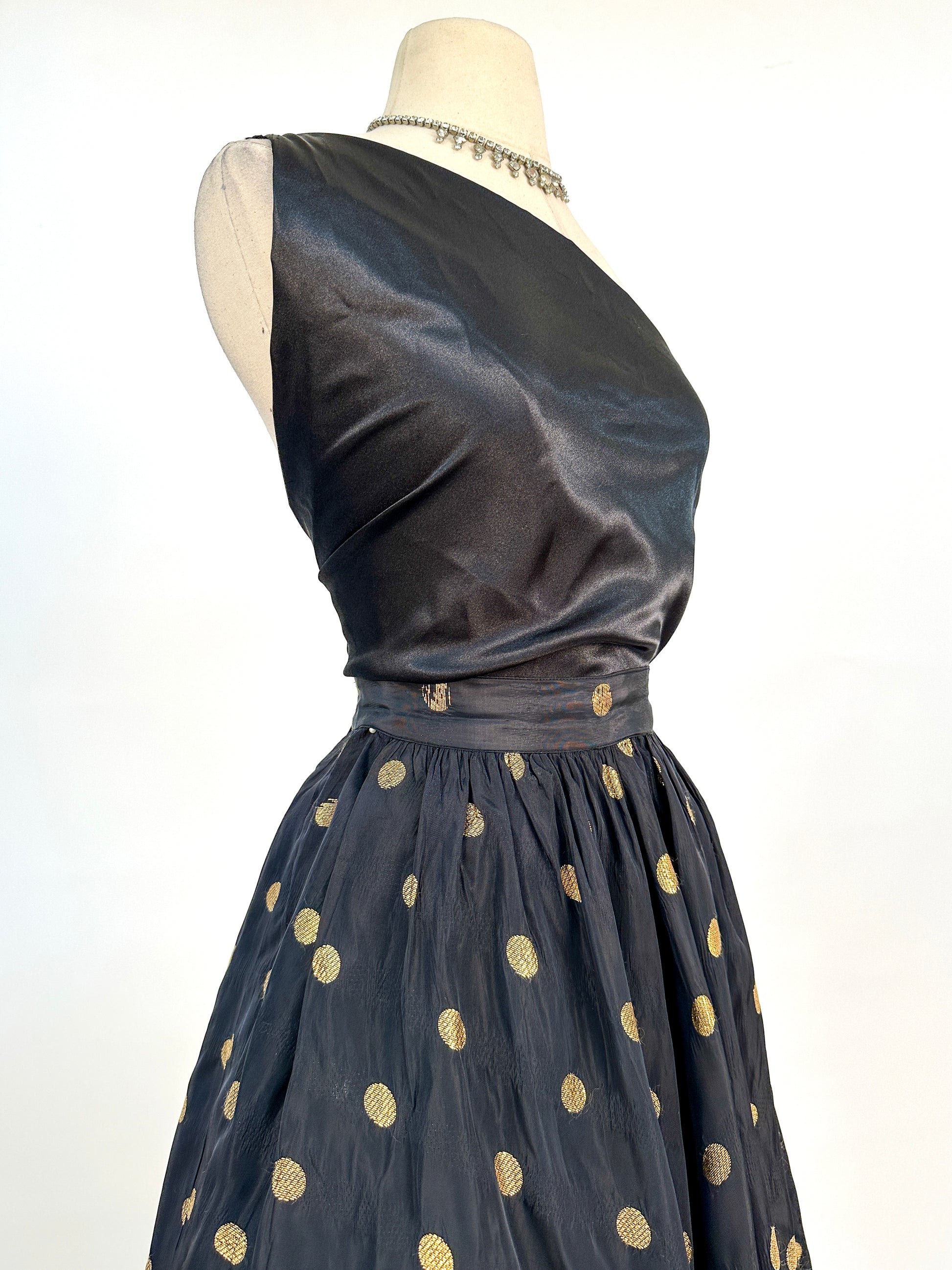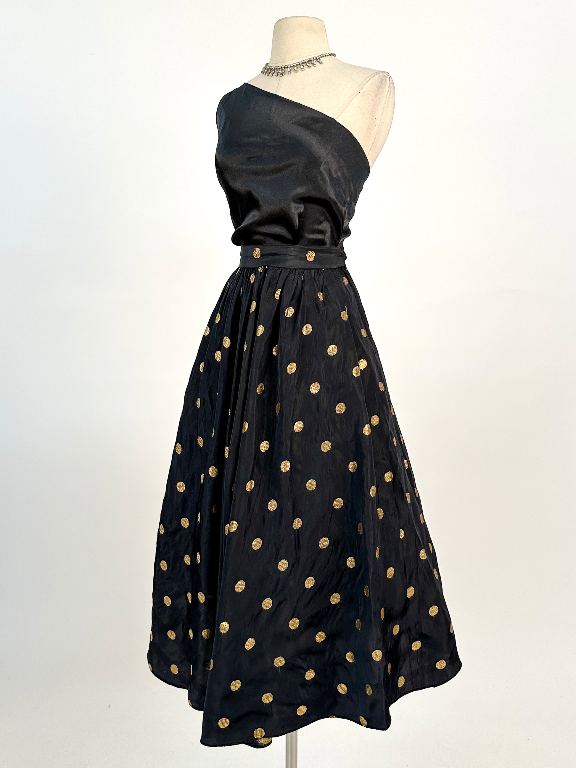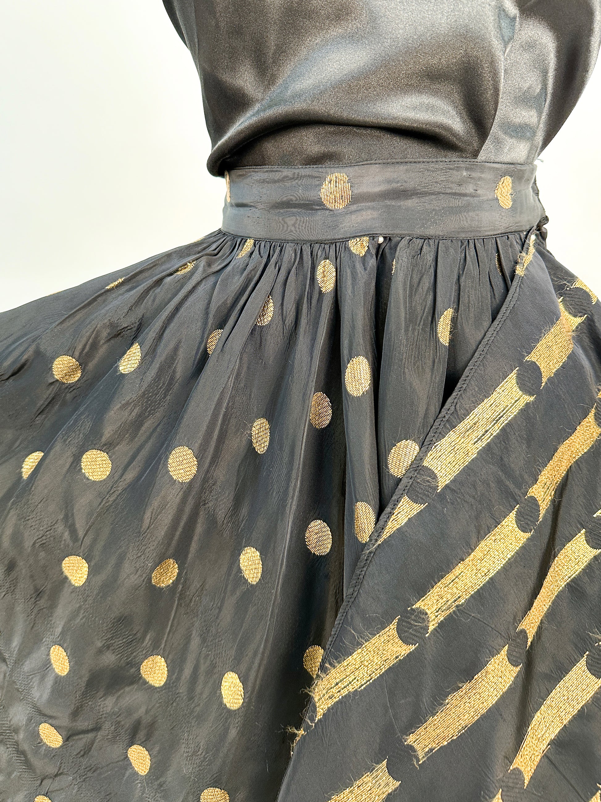 Stunning black jacquard with woven gold polka dots circle skirt with POCKETS! Two side pockets that sit on the front hips and hidden within the folds. A side metal zipper closure Need I say more?! Perfect addition to a ready-to-wear wardrobe.