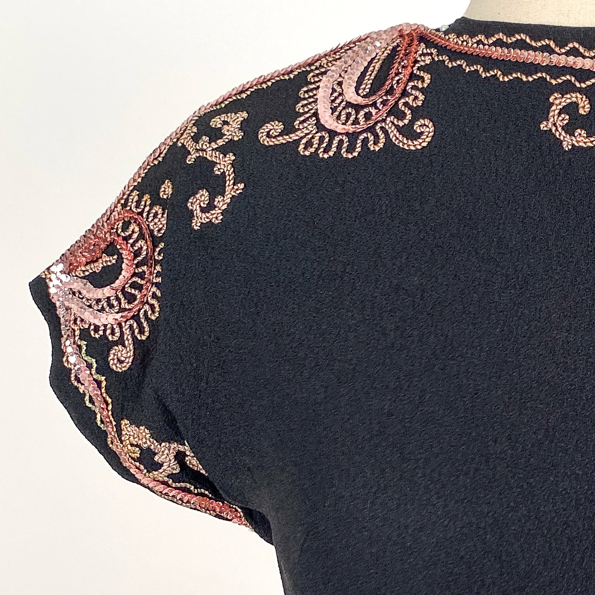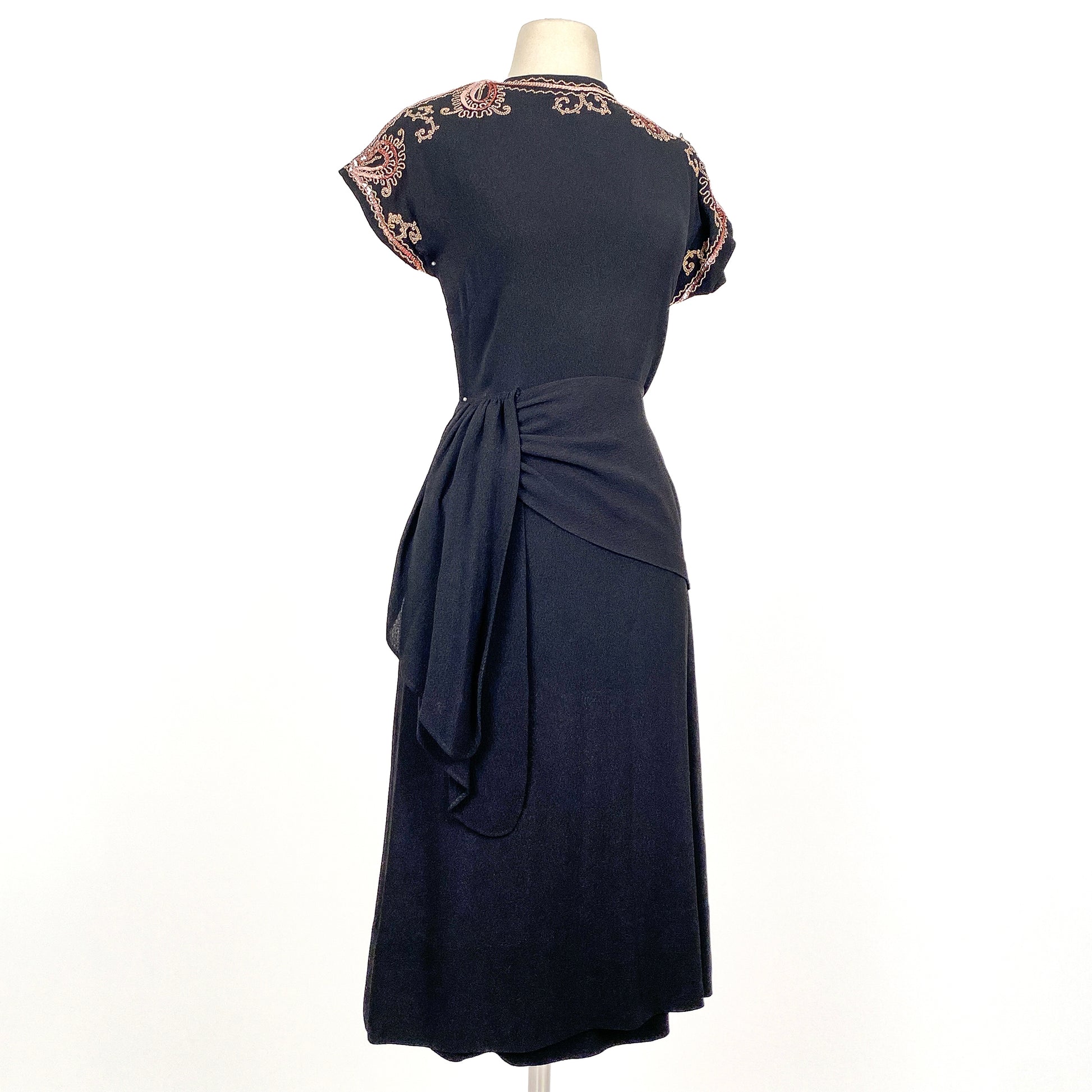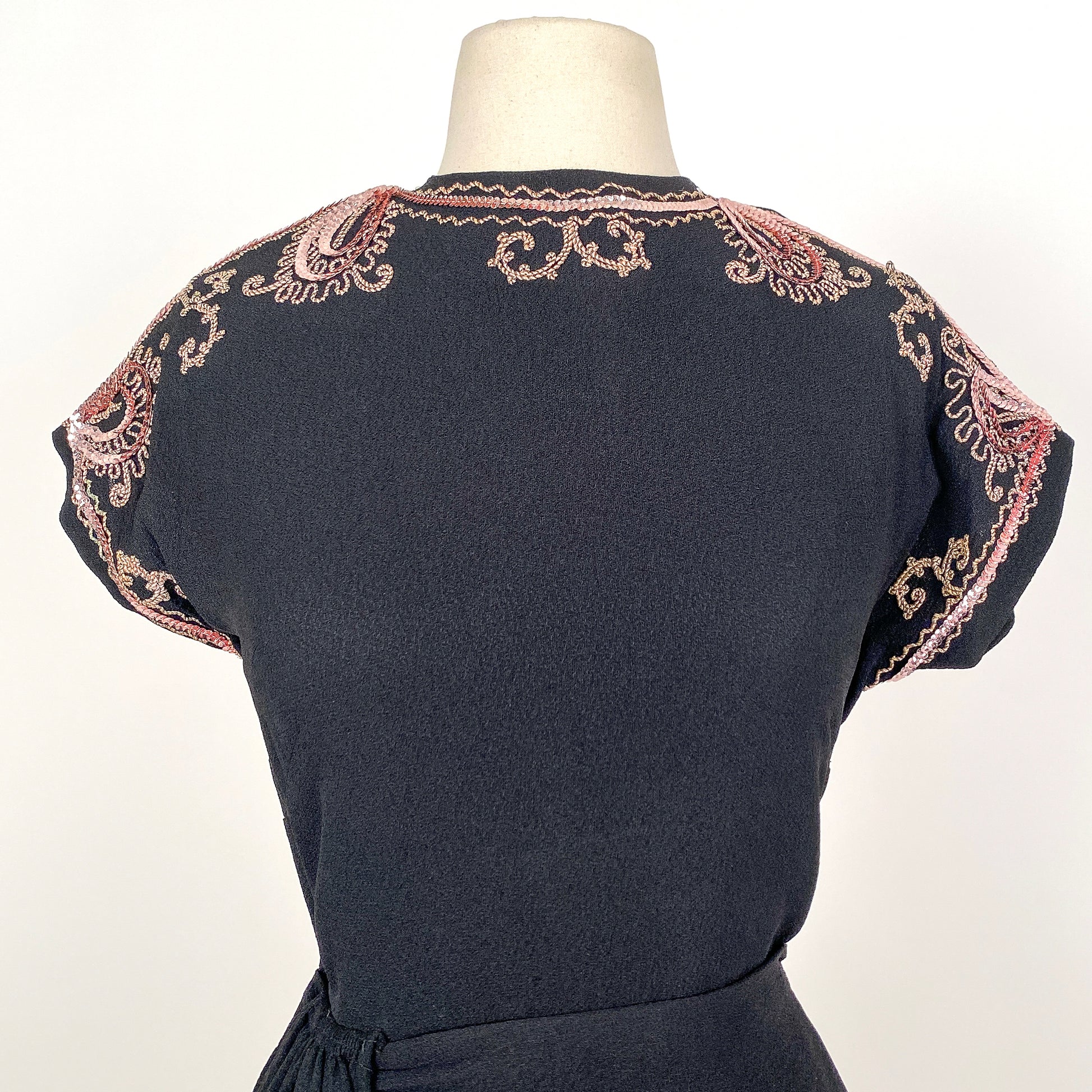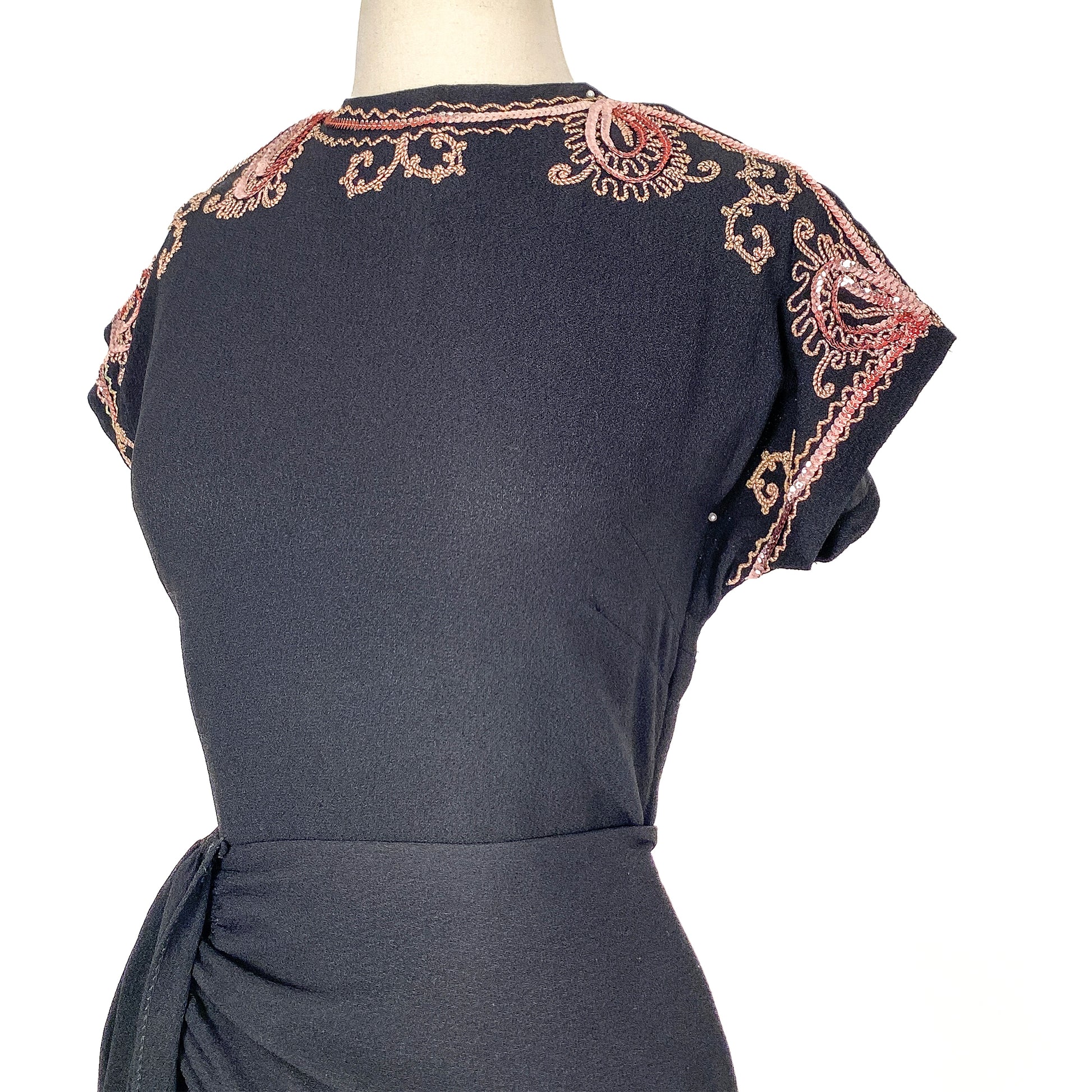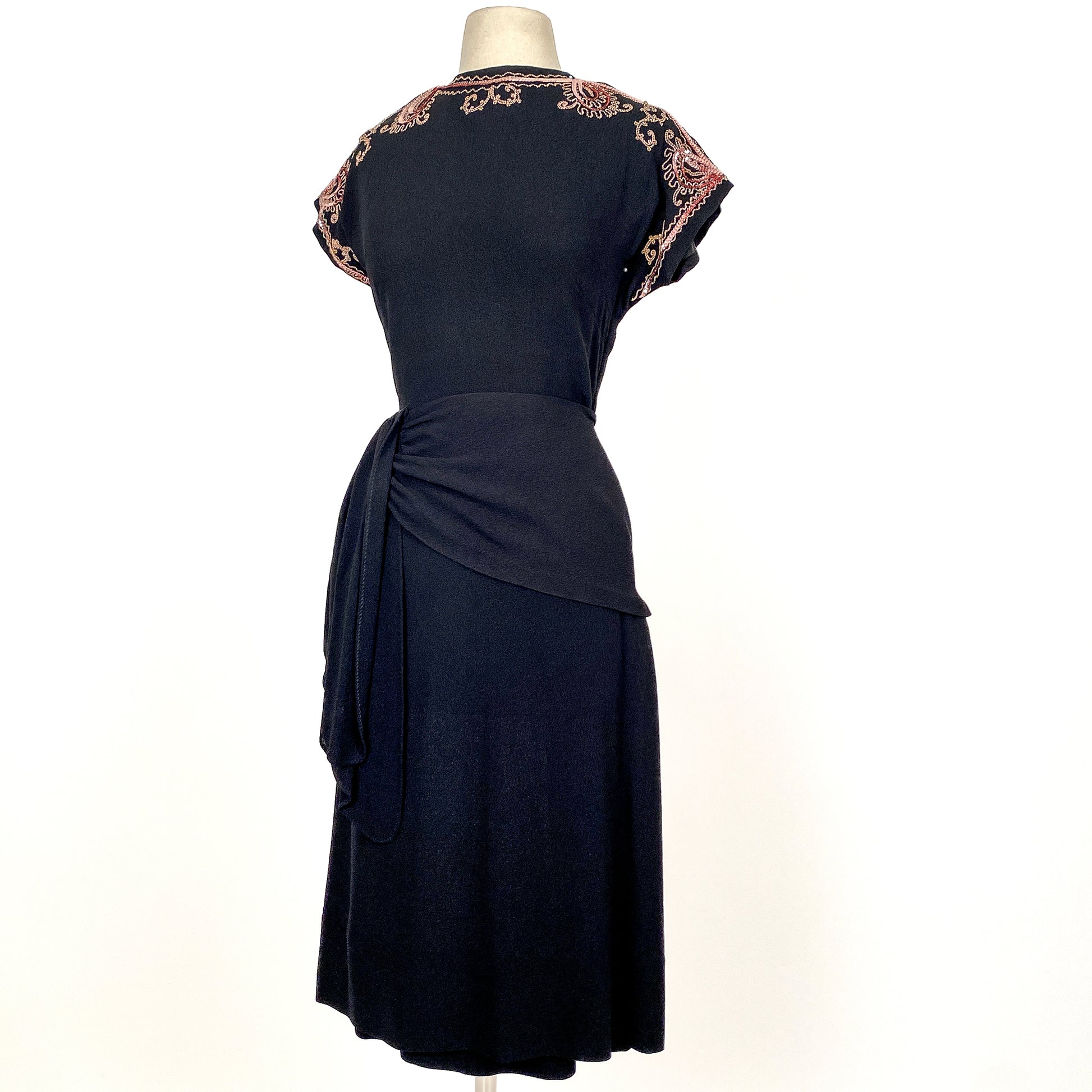 An ultra chic 1940s crepe LBD with pink sequin and soutache trim adorning the neckline. The peplum is created by a draped fabric piece with hooks that connects under the vertical side fabric. The peplum wraps around the back. Side zipper with button closer on back of neck.