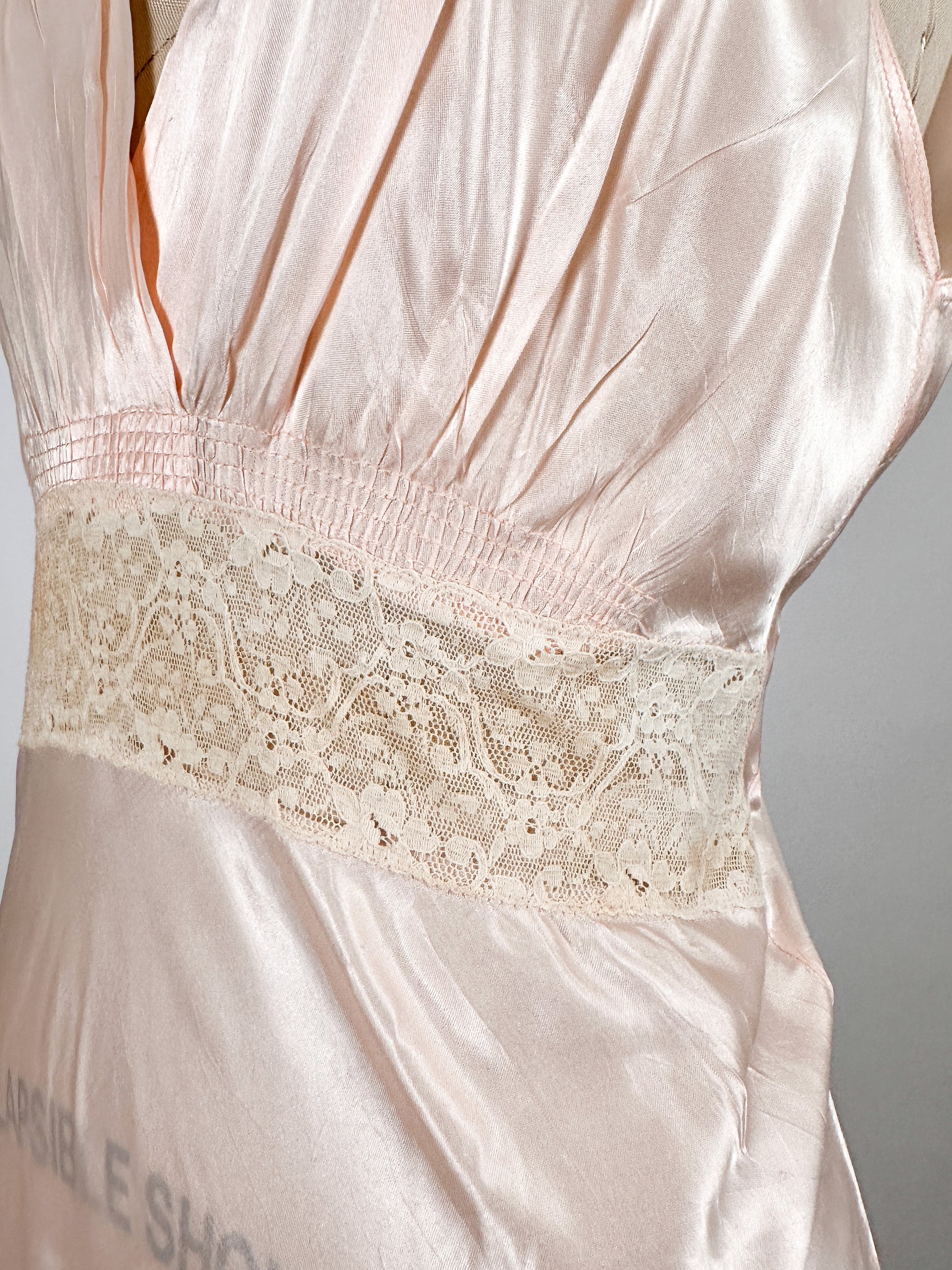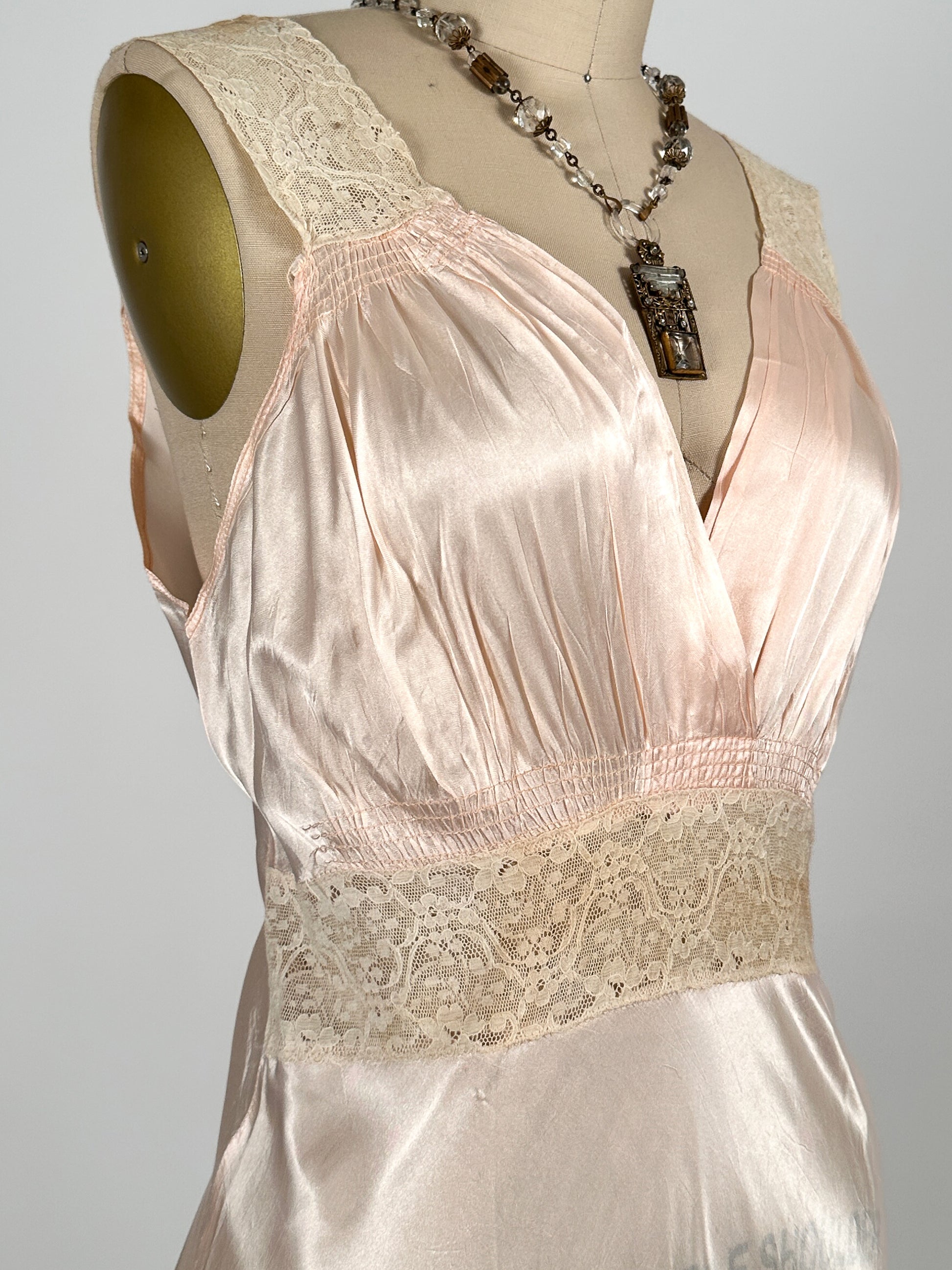 A stunning bias cut pale pink 1940s nightgown made out of glossy liquid satin rayon with lace inserts on the shoulders and waistline.