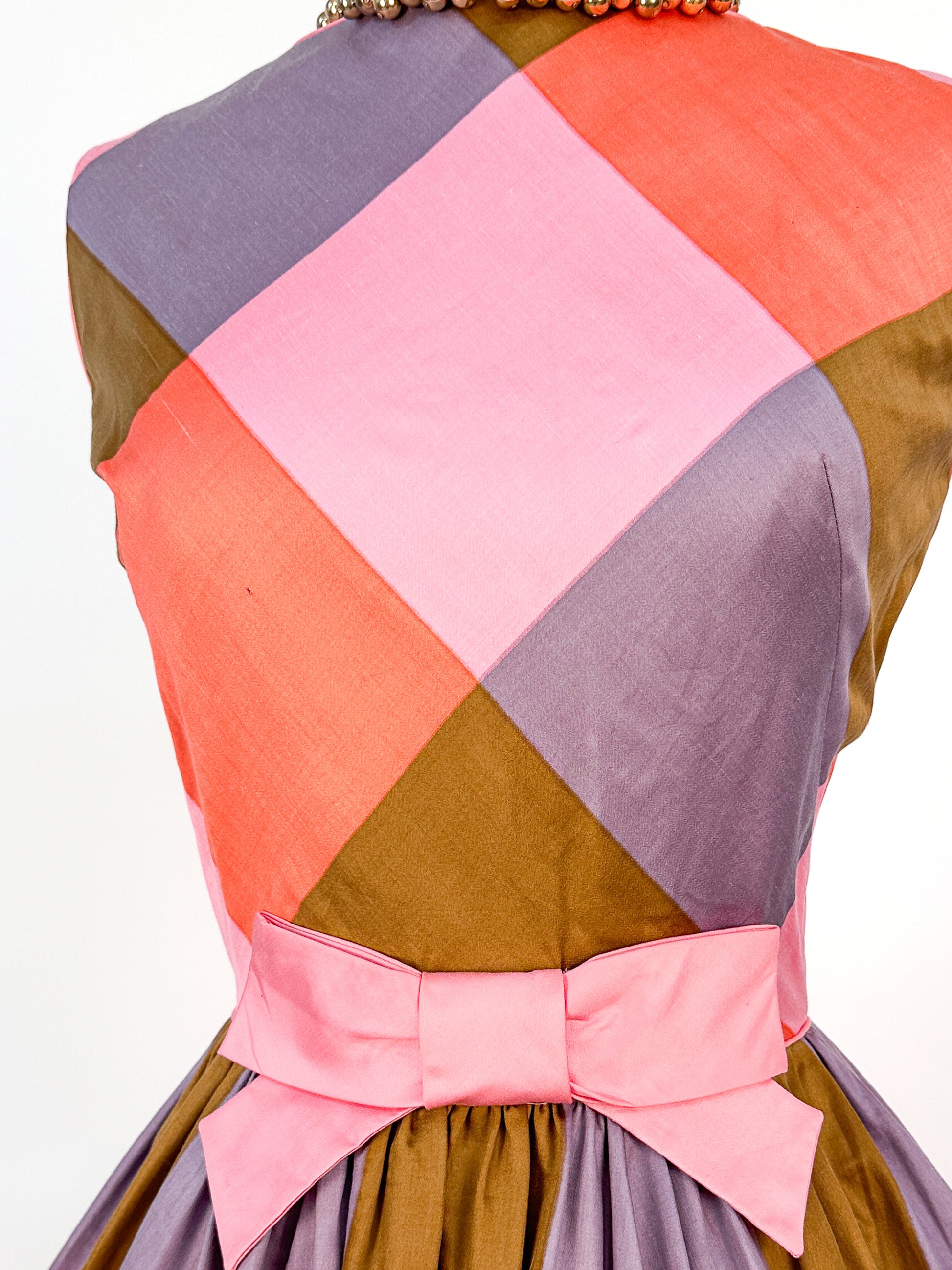 1950 – 60s Cotton Color-Block Plaid Bubble Dress / Waist 26