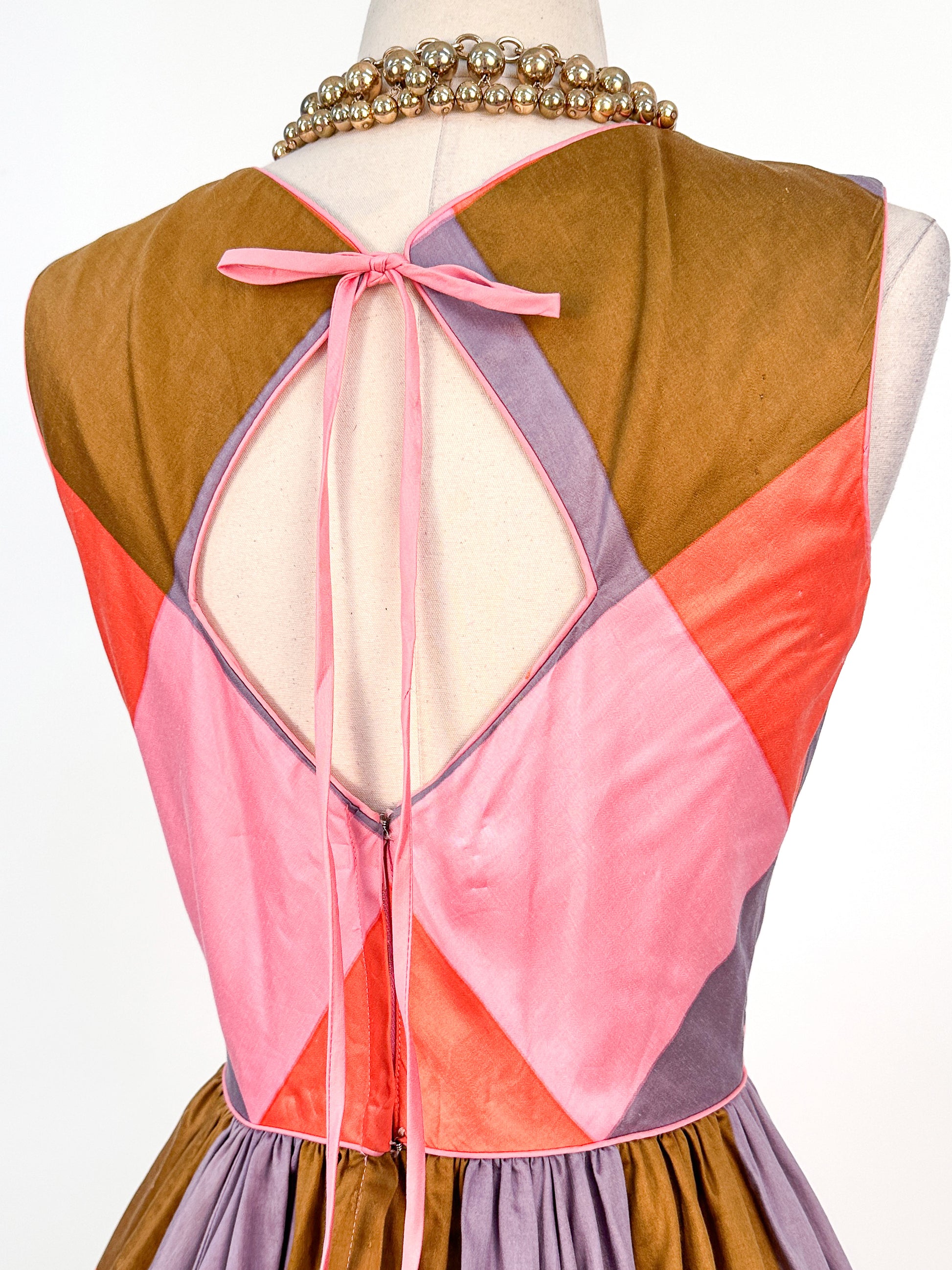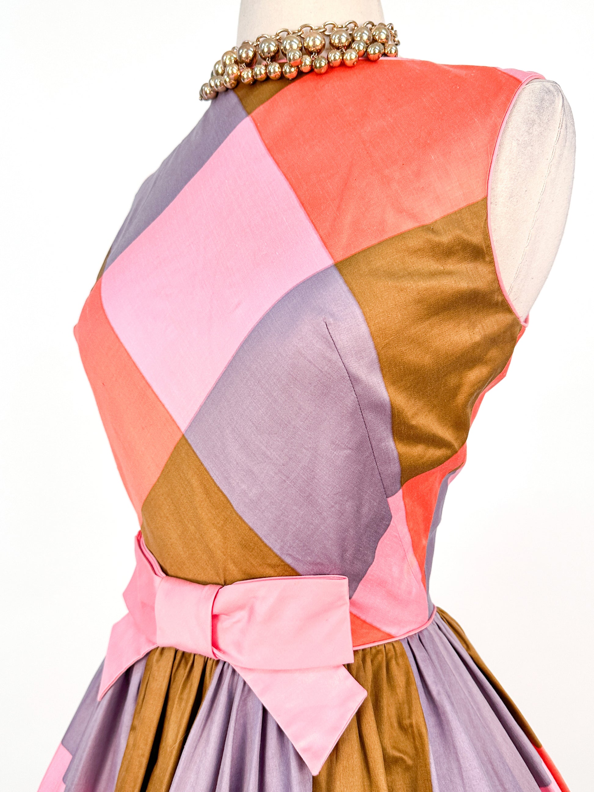 A bubble dress dream! A polished cotton color-blocked plaid with fitted bodice and full skirt with ruched hemline to create a 'bubble' silhouette. A pretty pink bow on the waistline matches the piped trim around the neckline, arms and waistband. As if this dress couldn't get any sweeter, a cutout keyhole back mirrors the shape in the plaid design. Back zipper with hook/eye and ties for closures. Please note, that the fullness of the skirt was achieved with a crinoline underskirt, which is not included.