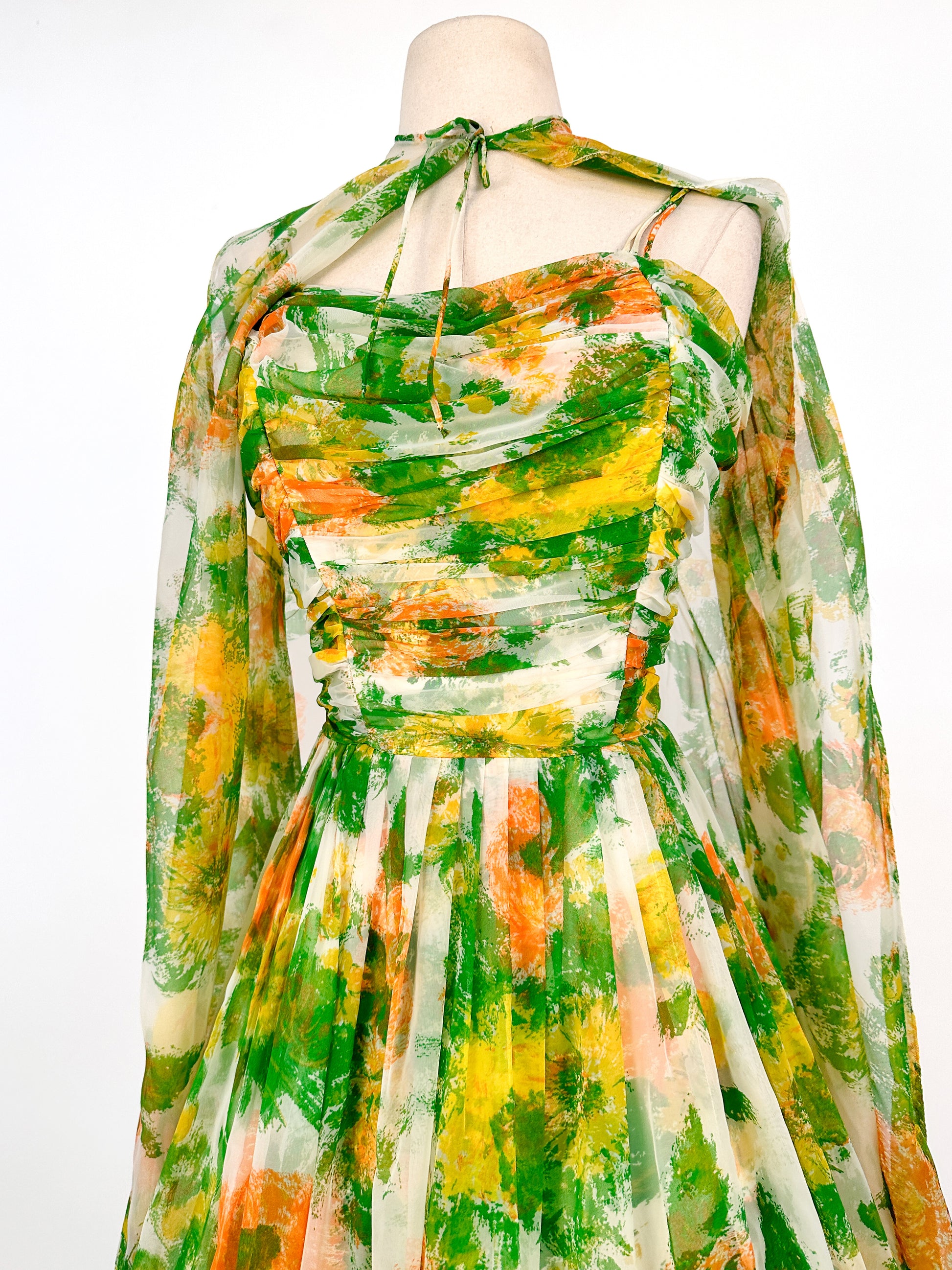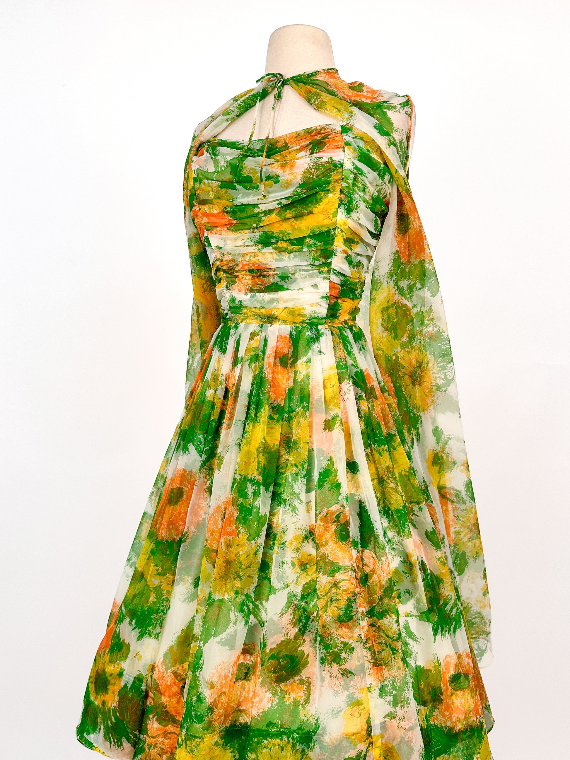 1950-60s Floral Chiffon Dress with Matching Cape / Waist 27