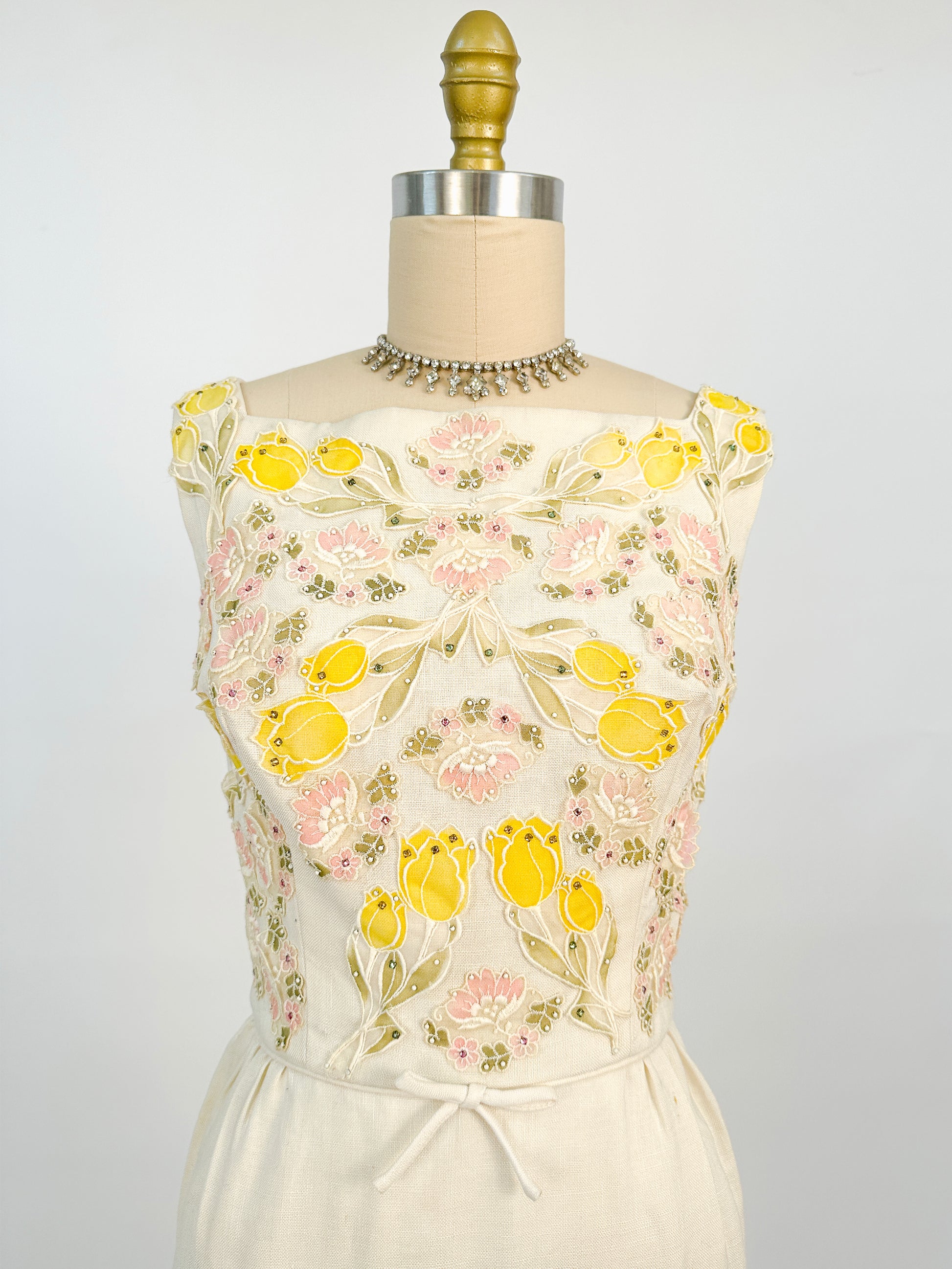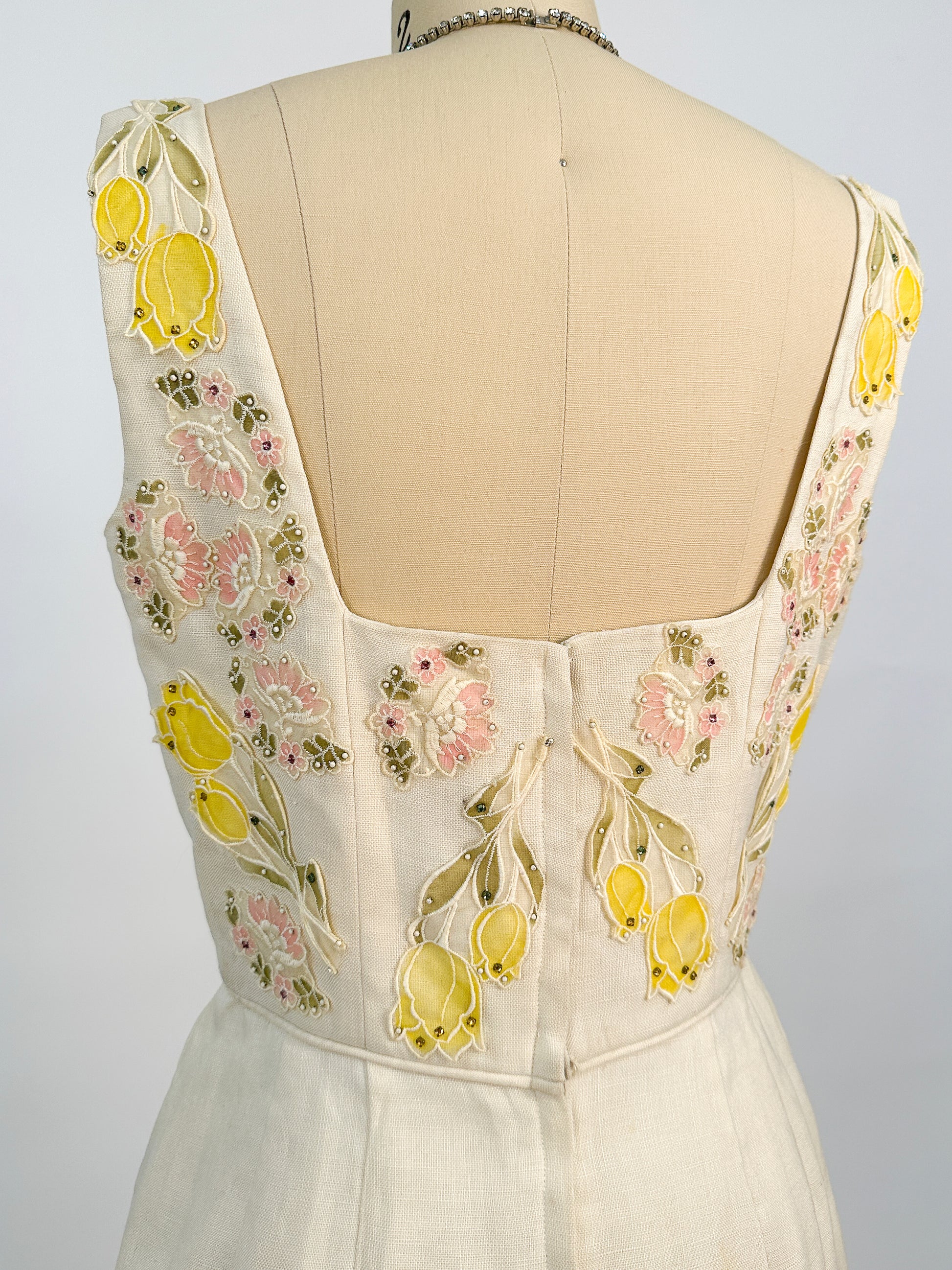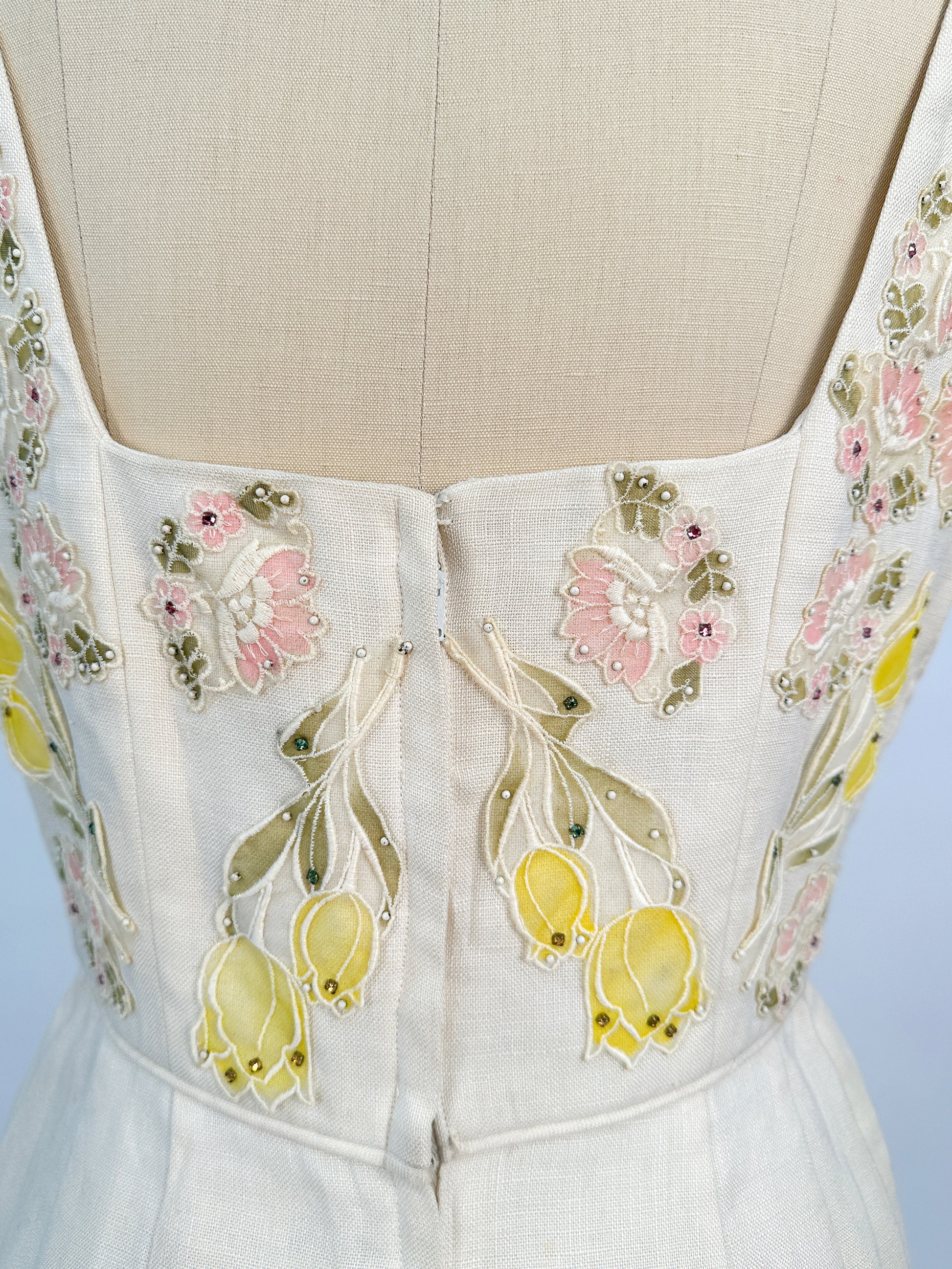 1950s Cream Linen Dress with Rhinestones and Floral Appliqués / Waist 28