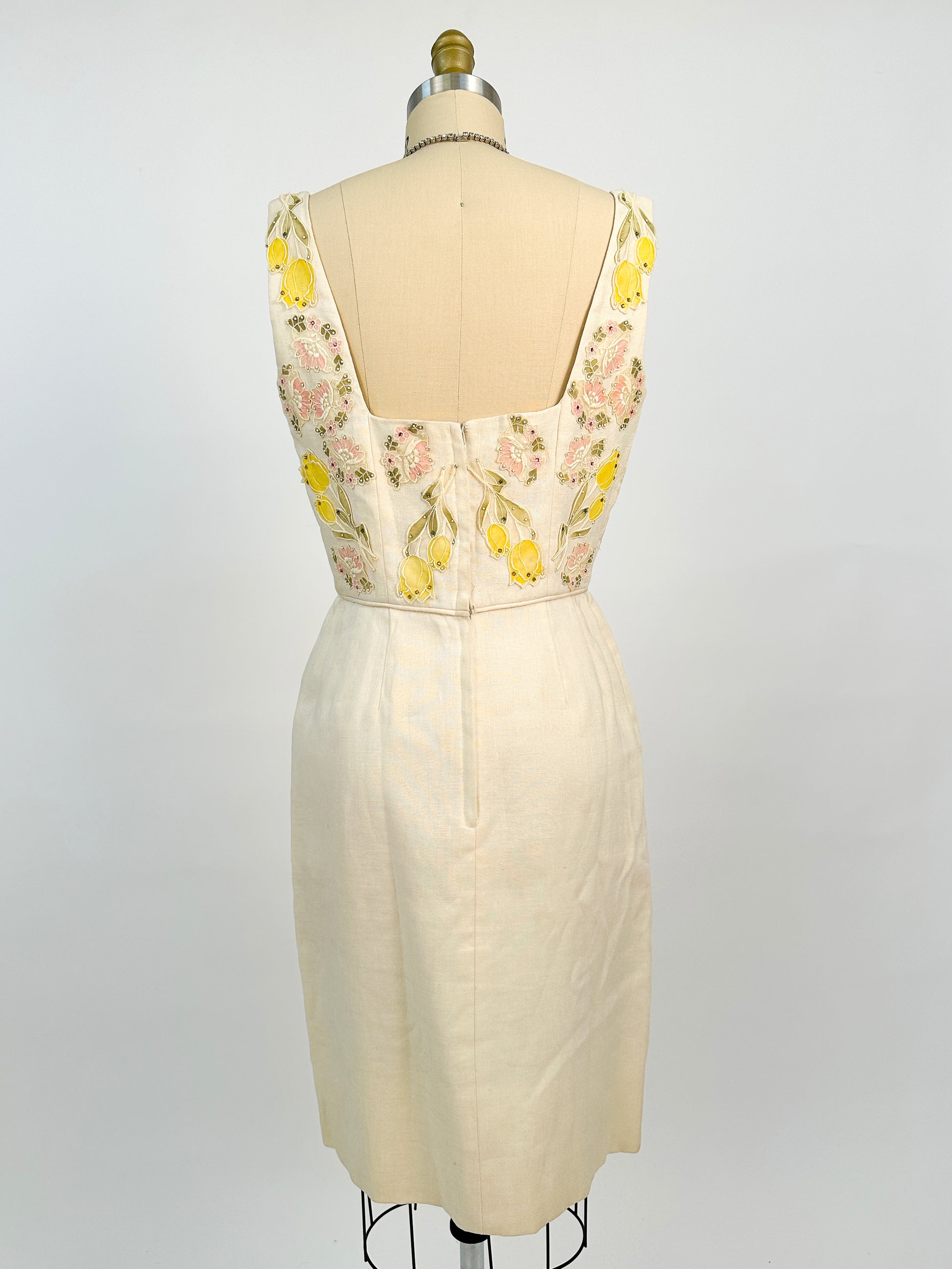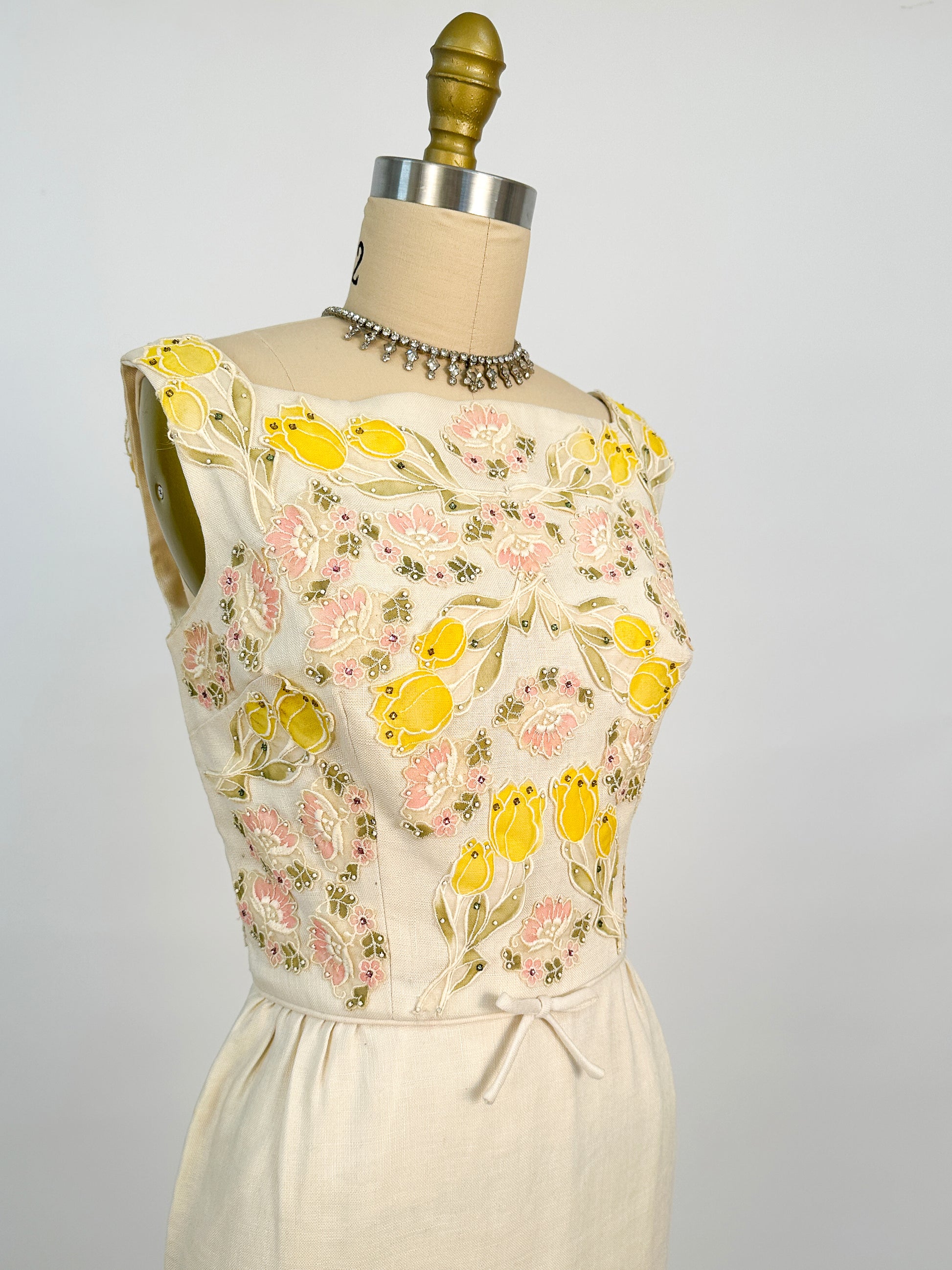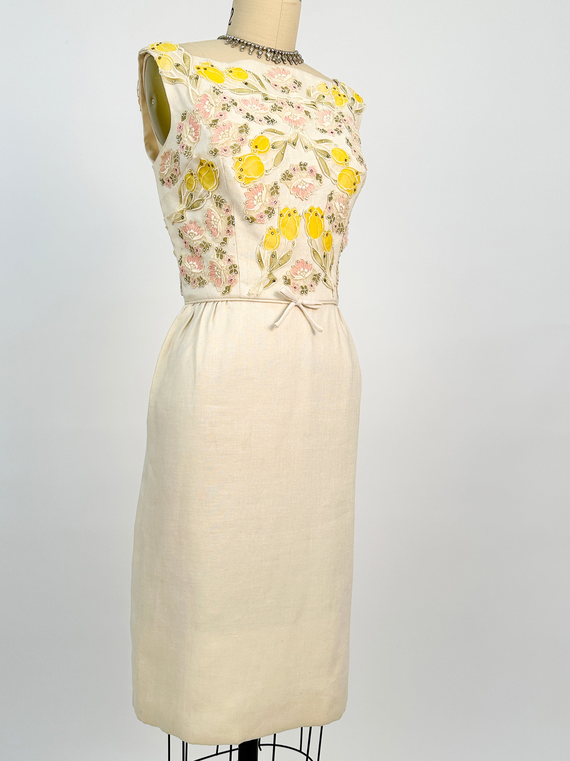 This is a gorgeous cream Irish linen wiggle dress is perfect for spring and summer. A square neckline with pastel tulip and floral appliqués covering the bodice front and back with studded and pastel rhinestones sprinkled throughout. The dress is completely lined back metal zipper closure.