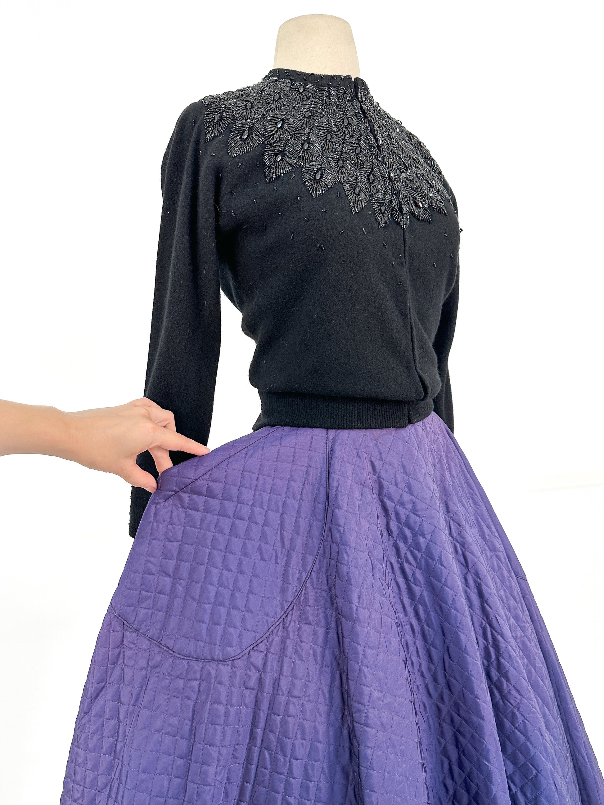 Condition: As Is vintage condition, the skirt is in good condition but has a few mended areas that very noticeable as they hide within the folds and quilted pattern of the skirt. Please see images.