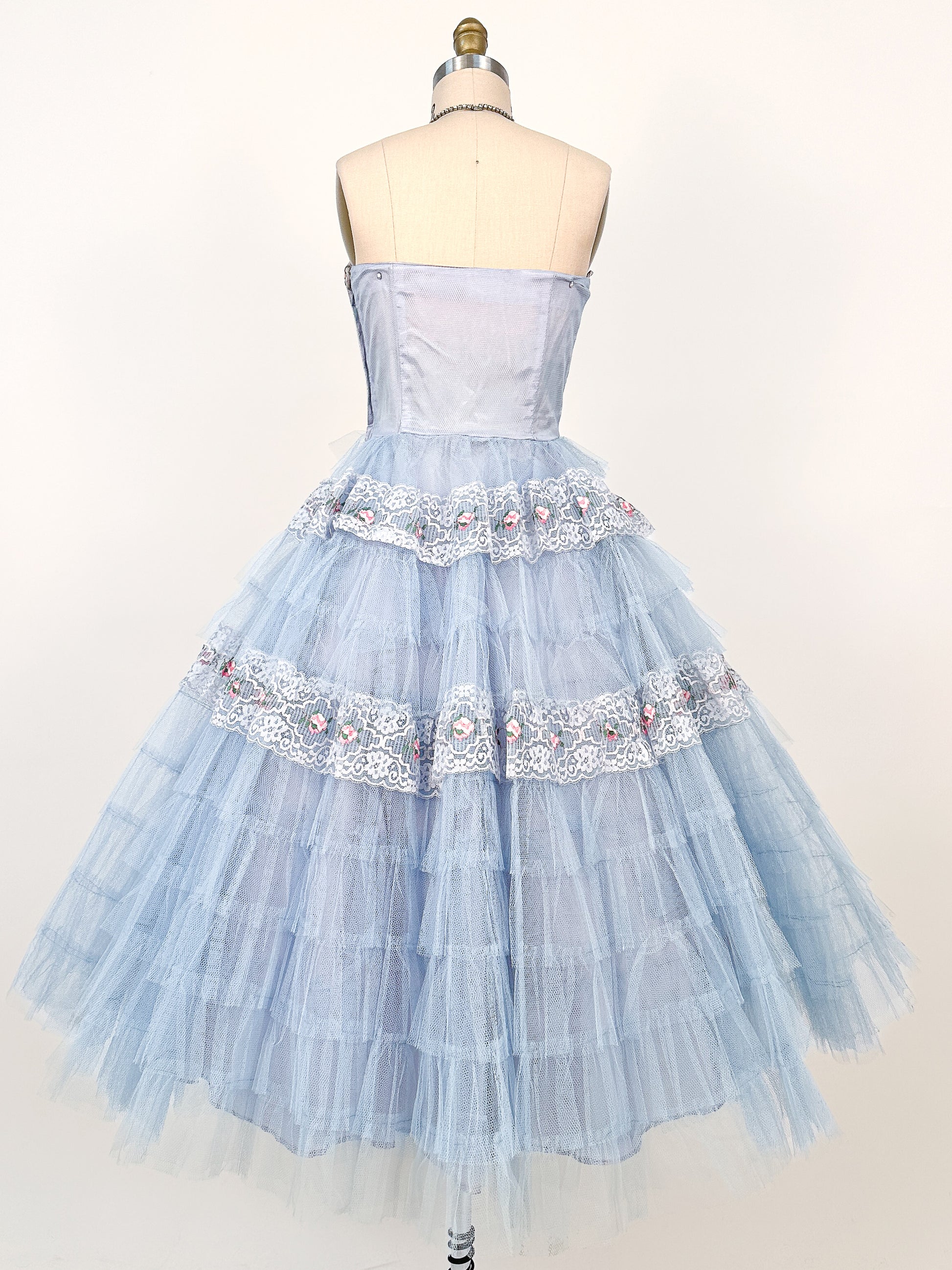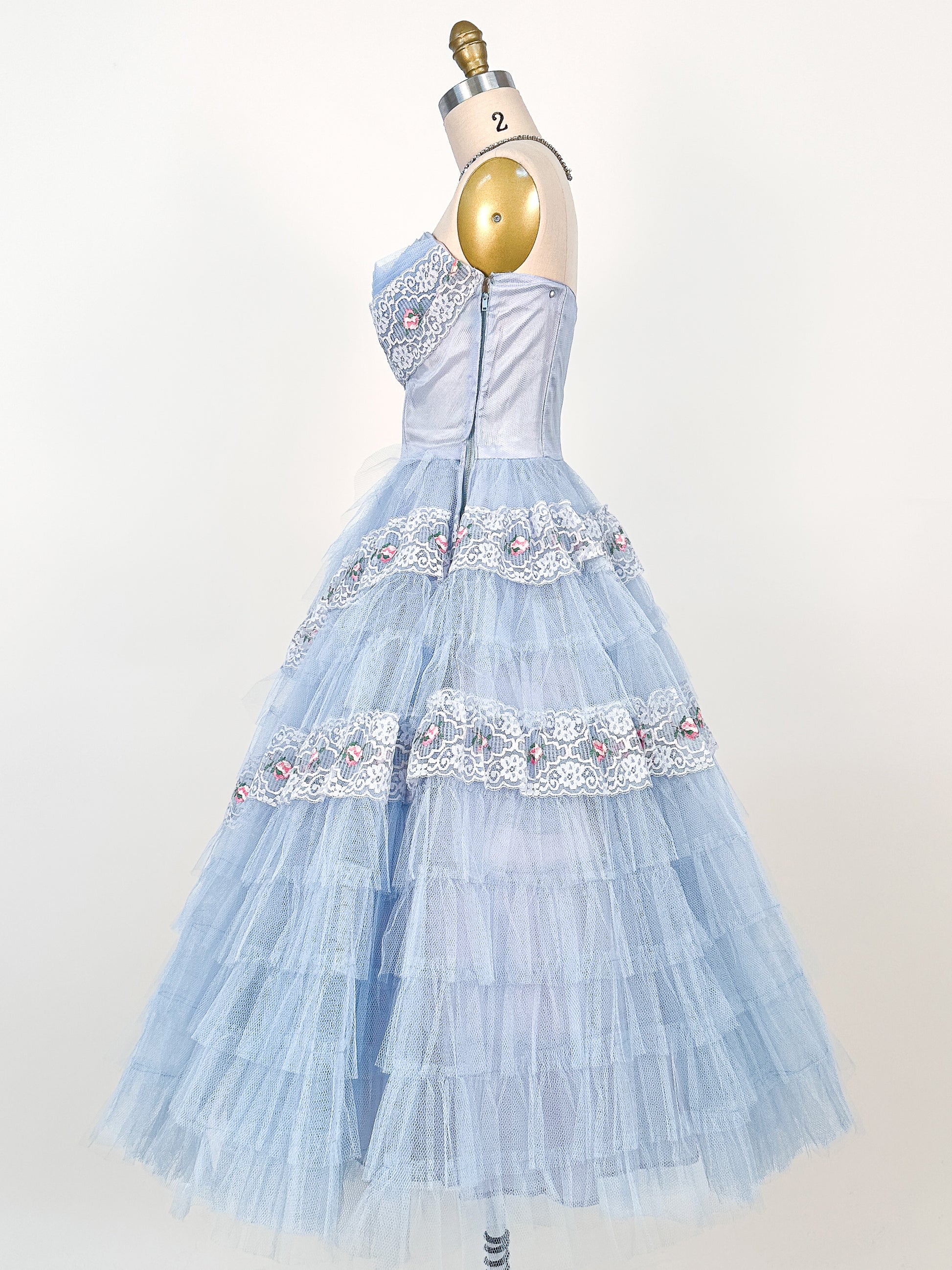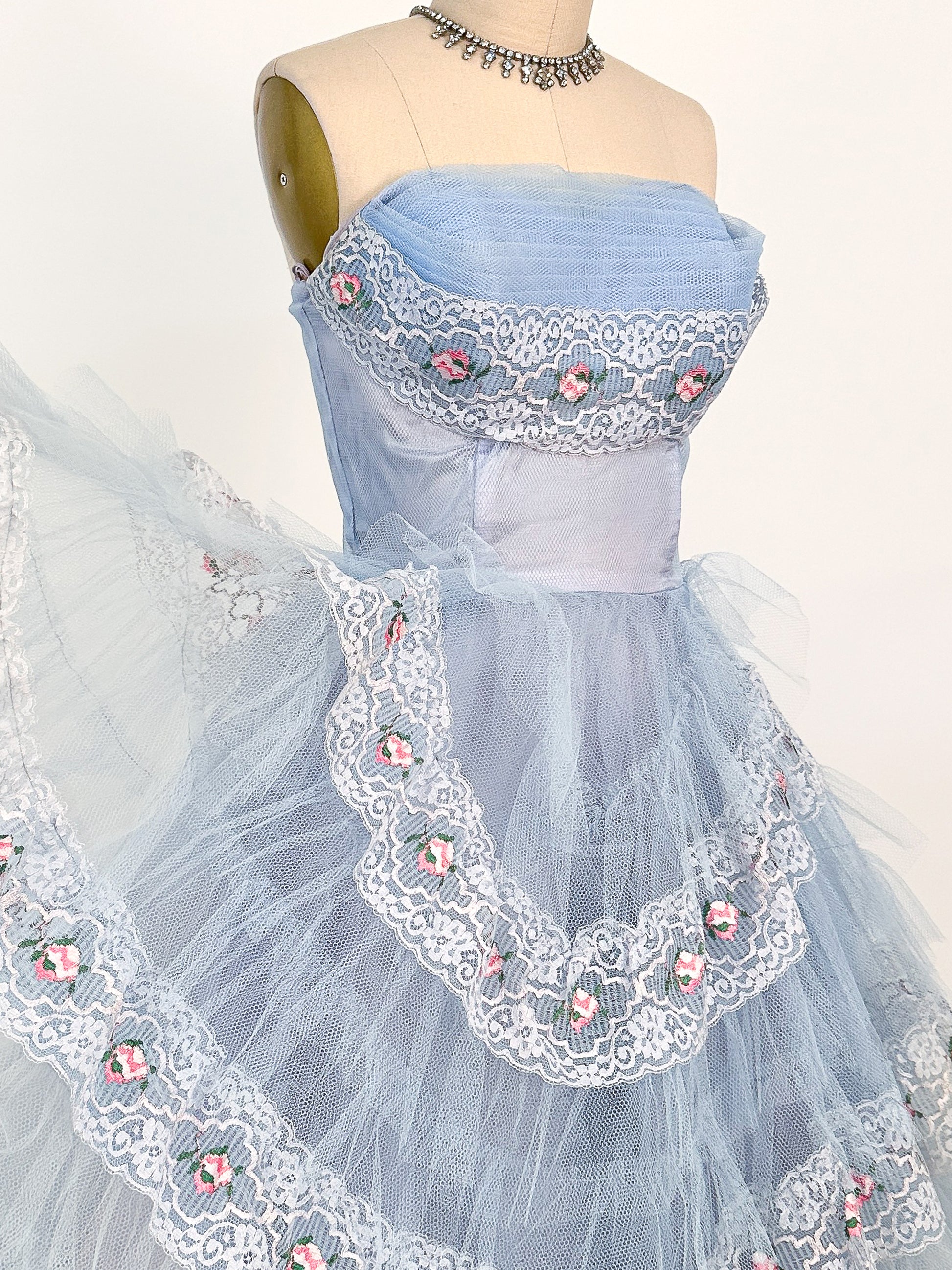 A dreamy timeless 1950s pale blue tulle strapless party dress. This dress features a voluminous tiered tulle skirt with ruffled tulle, an underskirt of tulle and strapless bodice, and intricate lace detailing with petit pink roses. Side metal zipper and hook/eye closure.