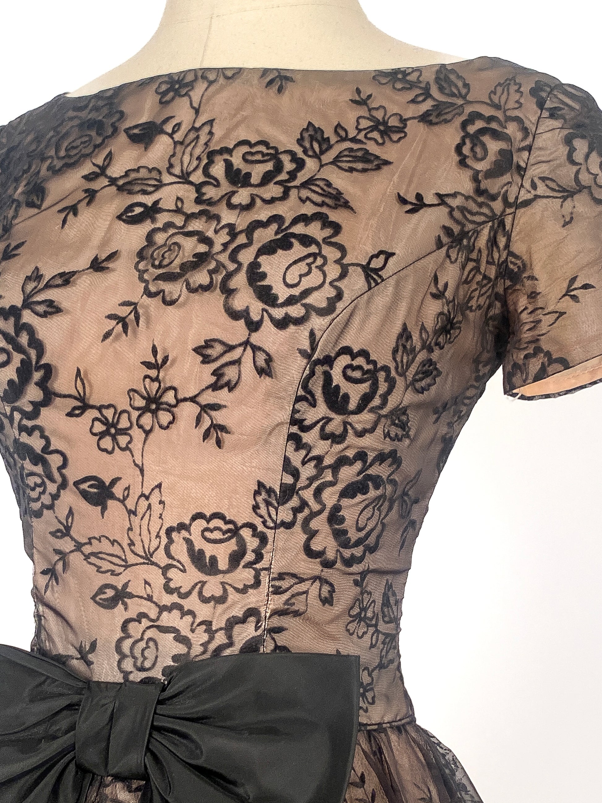 1950s Flocked Floral Party Dress with Satin Bow / Waist 26