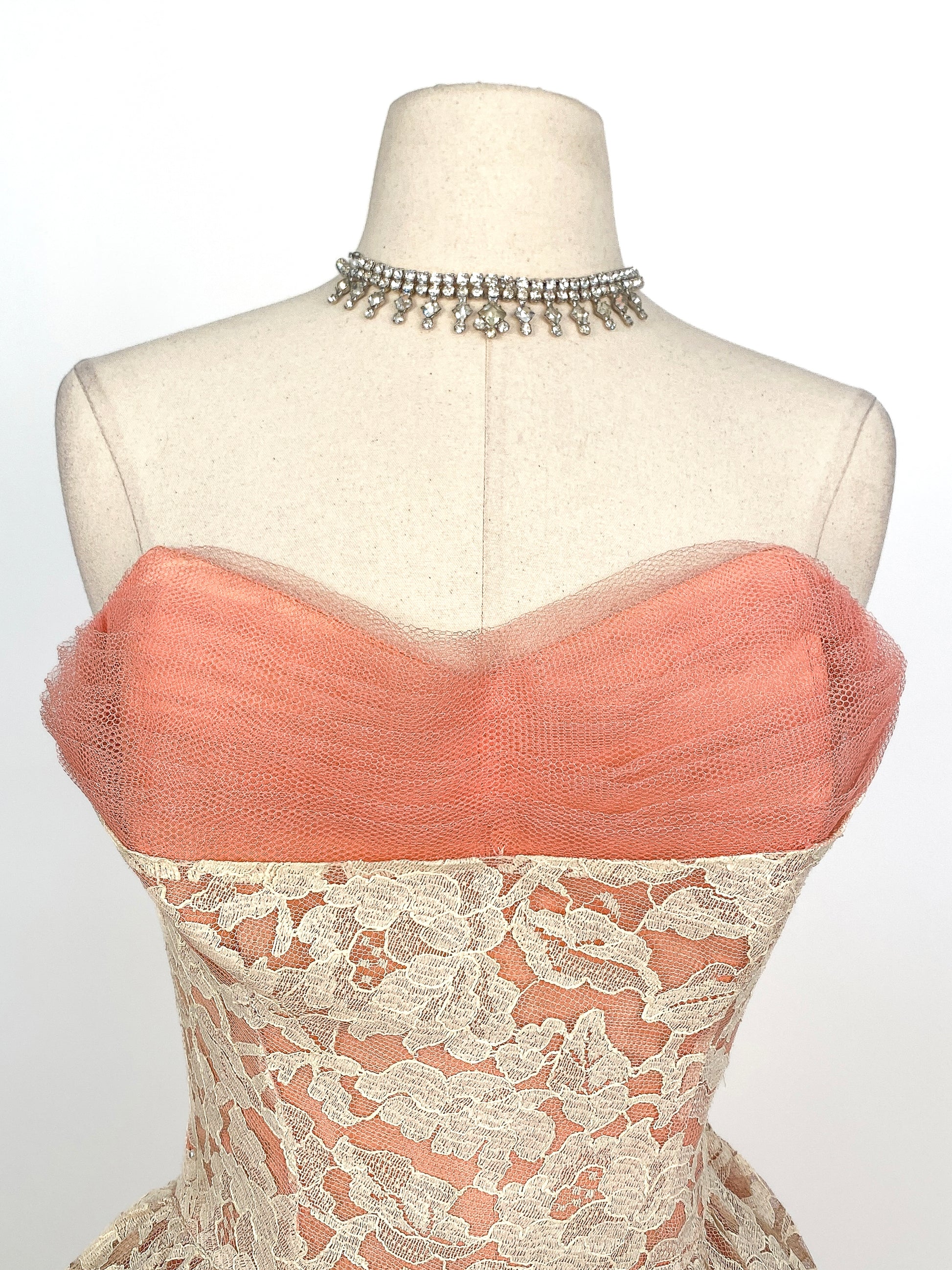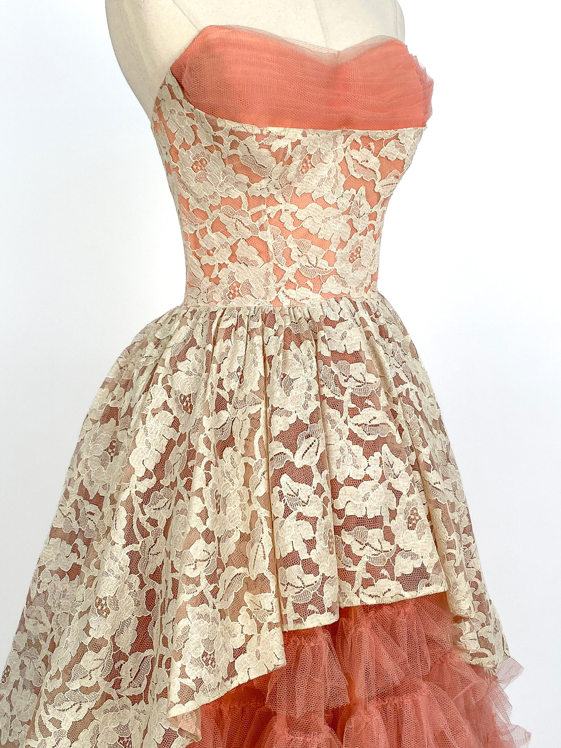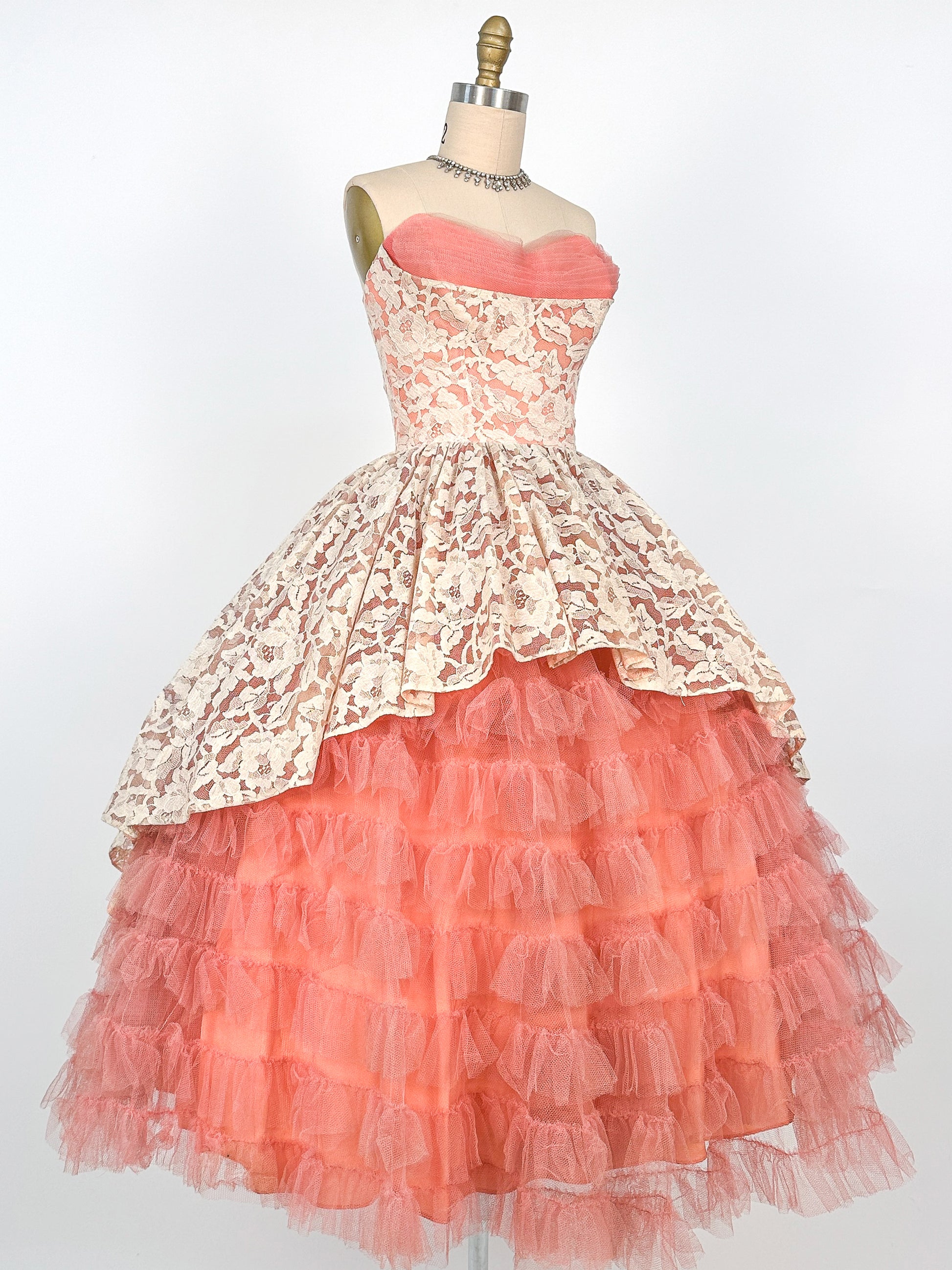 This 1950s dreamy lace & tulle gown is sure to be a showstopper. A romantic rose and floral lace and featuring multiple layers of ruffled tulle in a soft pink hue. The skirt is full and lined with a poly satin, this timeless piece is perfect for a special occasions as this exquisite dress is sure to make a statement. Boned bodice with metal side zipper and hook/eye closure.