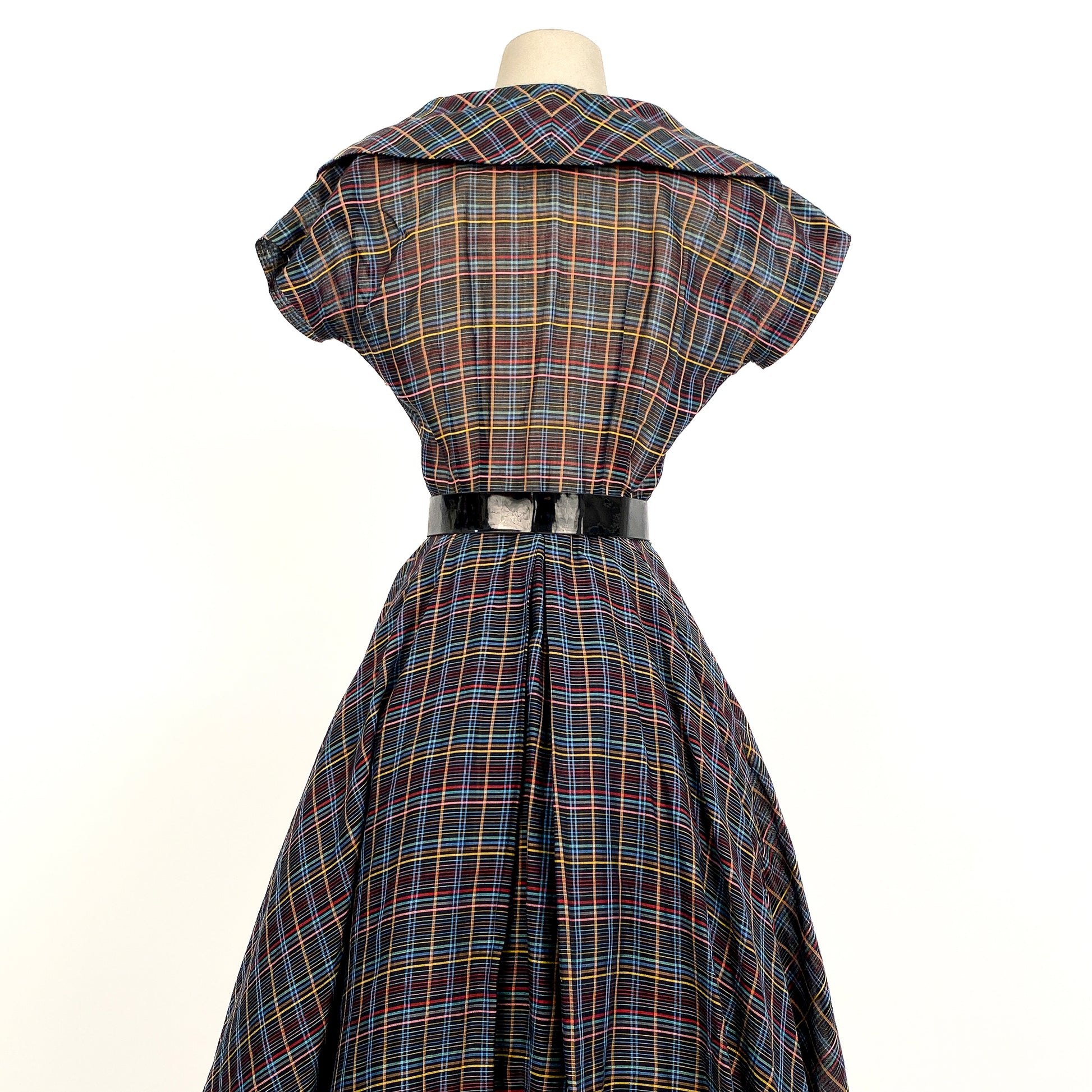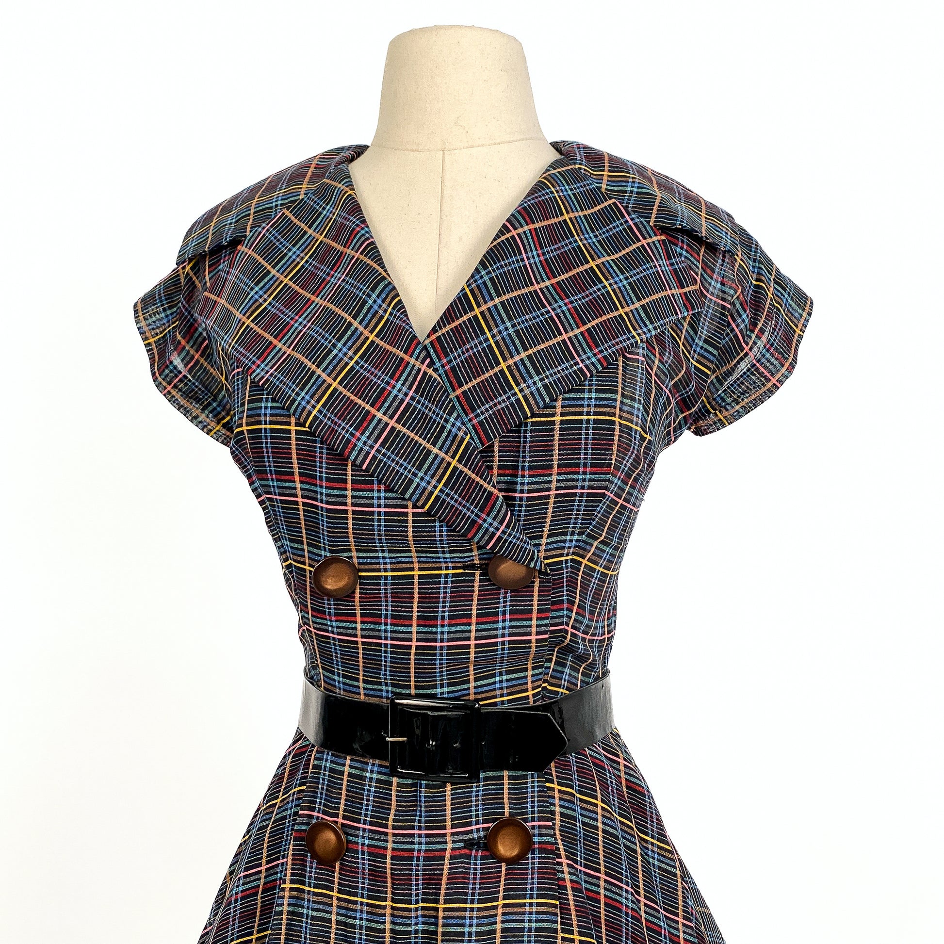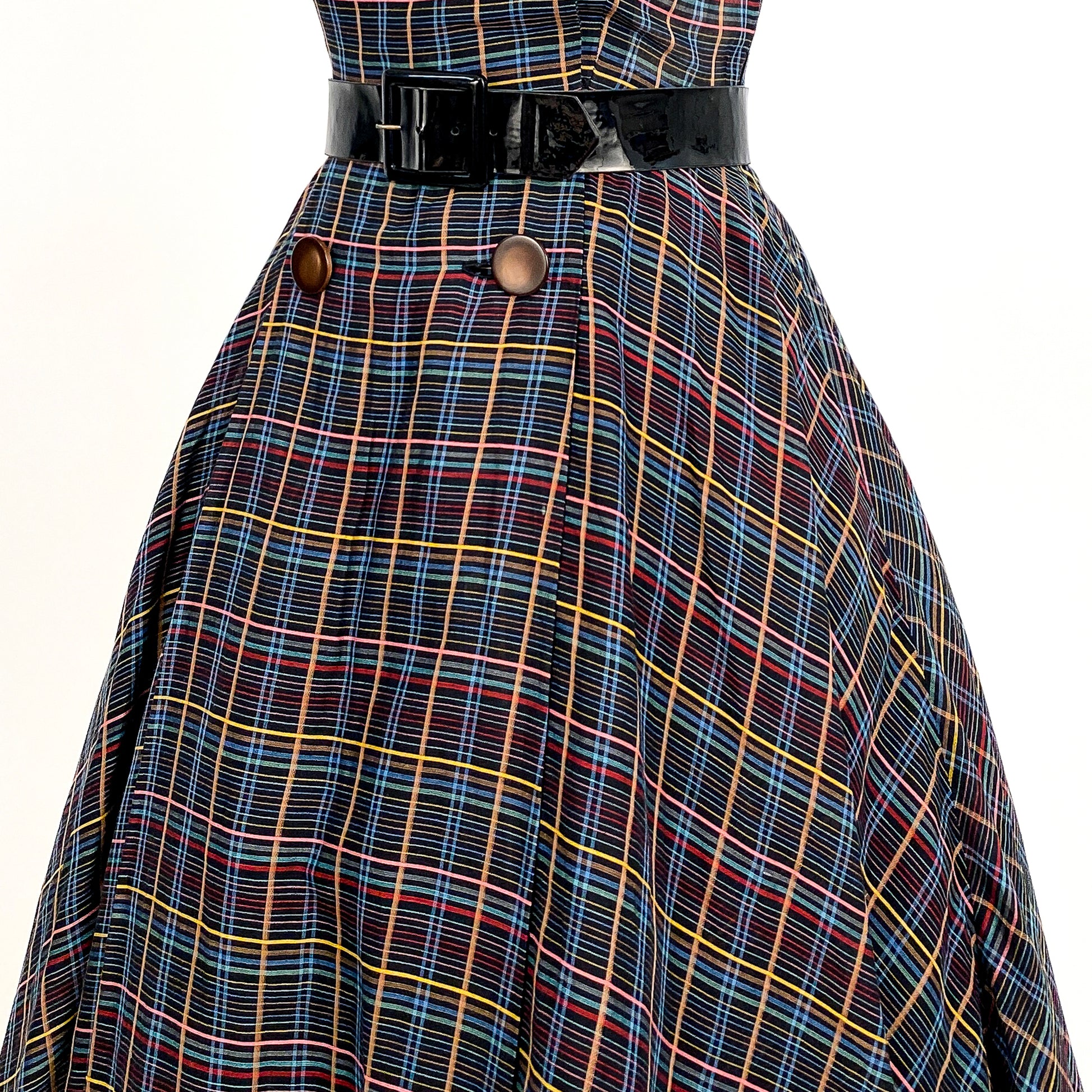 1950s cotton multi-colored plaid fit and flare dress. Black ground with an all over plaid print in yellow, red, blue and pink. Dramatic pointed collar and short sleeves. Large deep chocolate moon glow buttons on the front with hidden snaps for closure. Fitted waist and a full skirt. Shown with a petticoat to add fullness to the skirt. Detachable black patent leather belt.