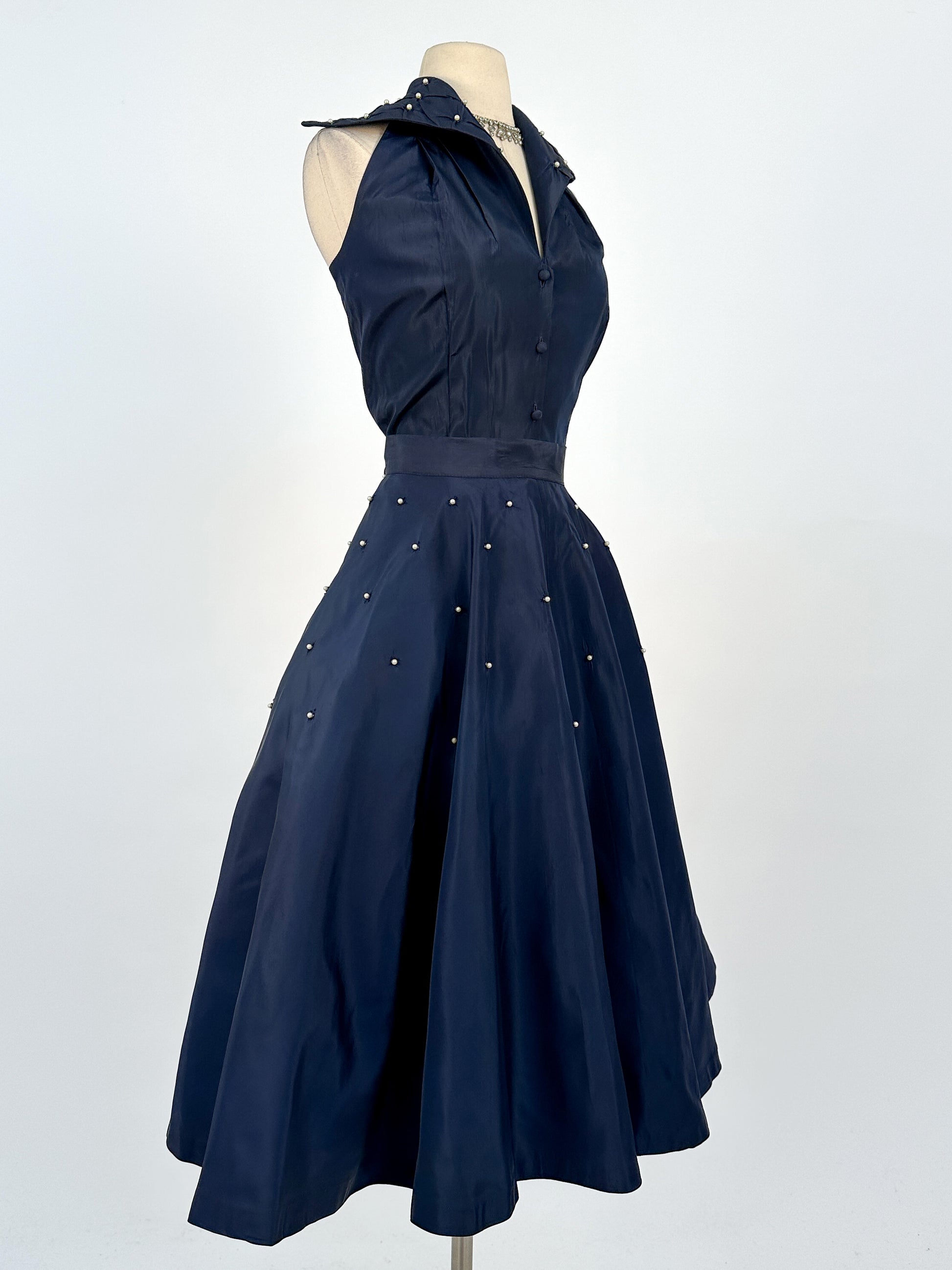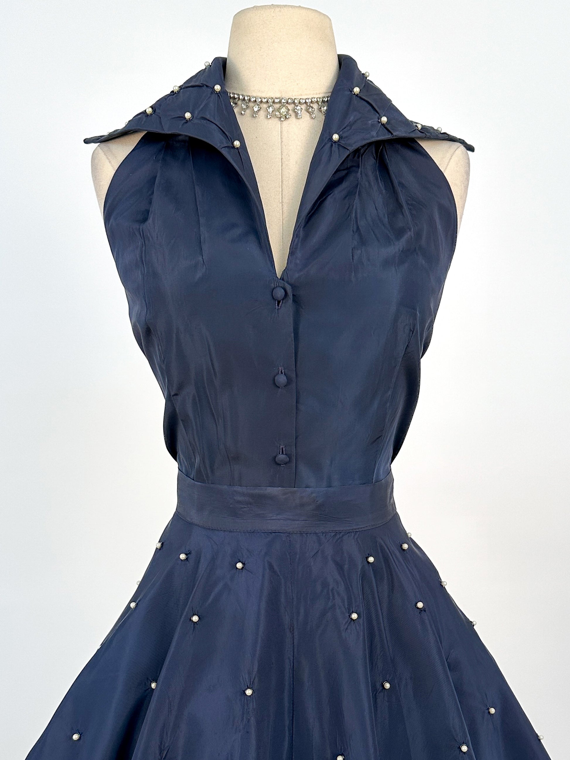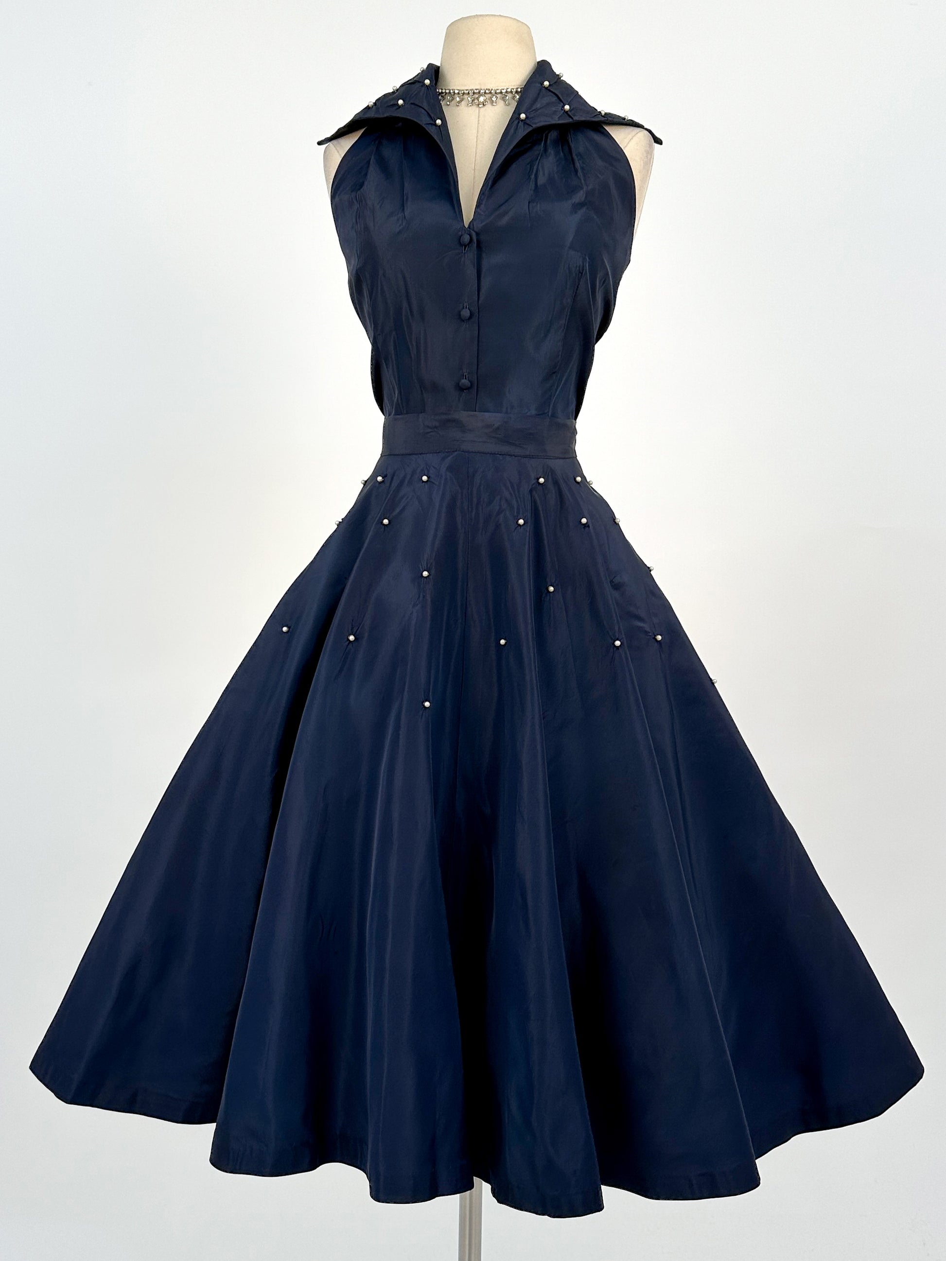 This exquisite two-piece ensemble made from navy taffeta is an glamorous day to night outfit. The halter top features a wide collar adorned with pearls and diamond-shaped gatherings. The full skirt is finished with a side metal zipper and double fabric-covered button waist closure. Sublimely classic, this 1950s piece is a must-have for any vintage wardrobe - can be worn together or separately.