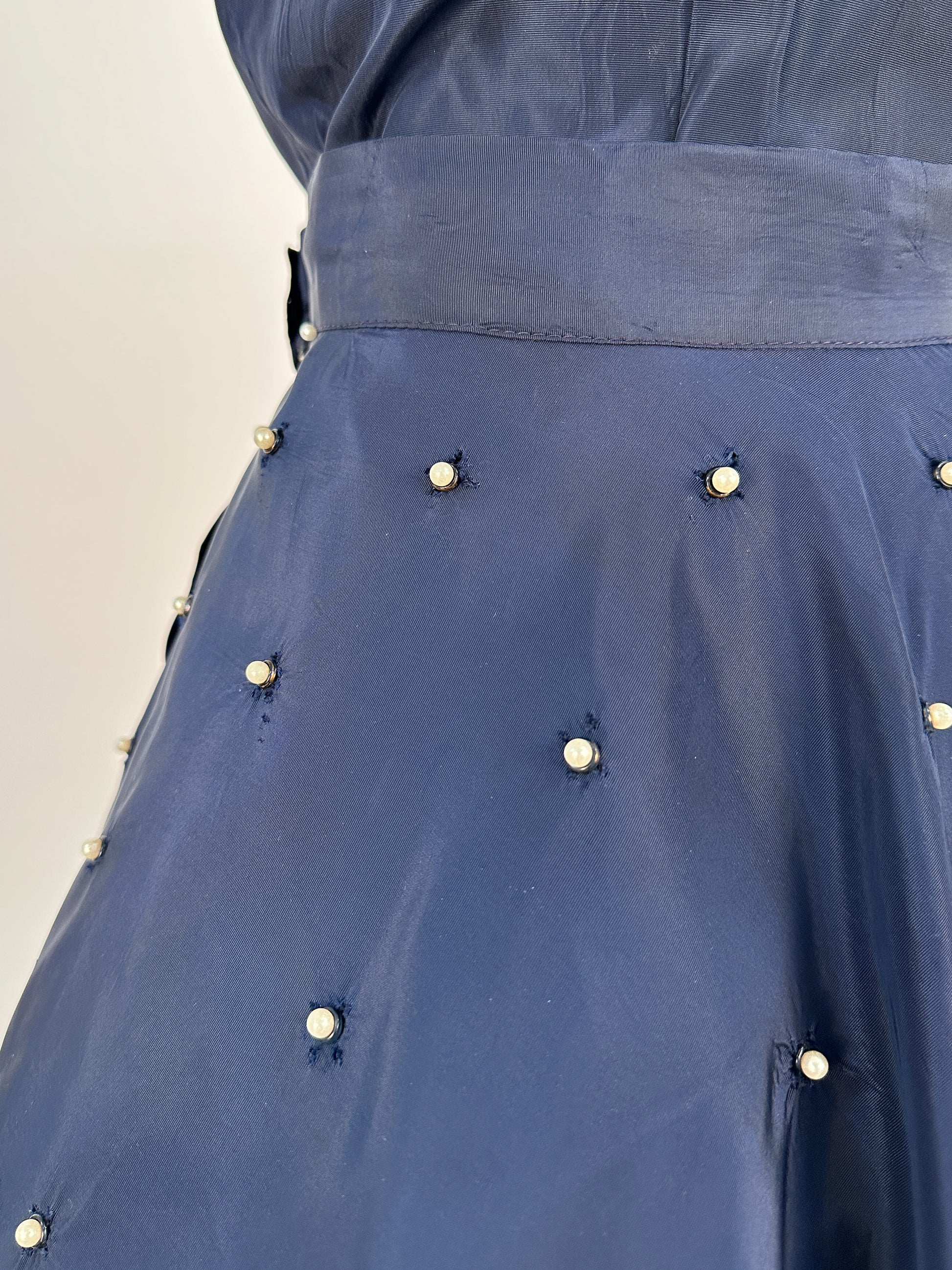 1950s Navy Taffeta Two-Piece Ensemble Adorned with Pearls / Waist 28