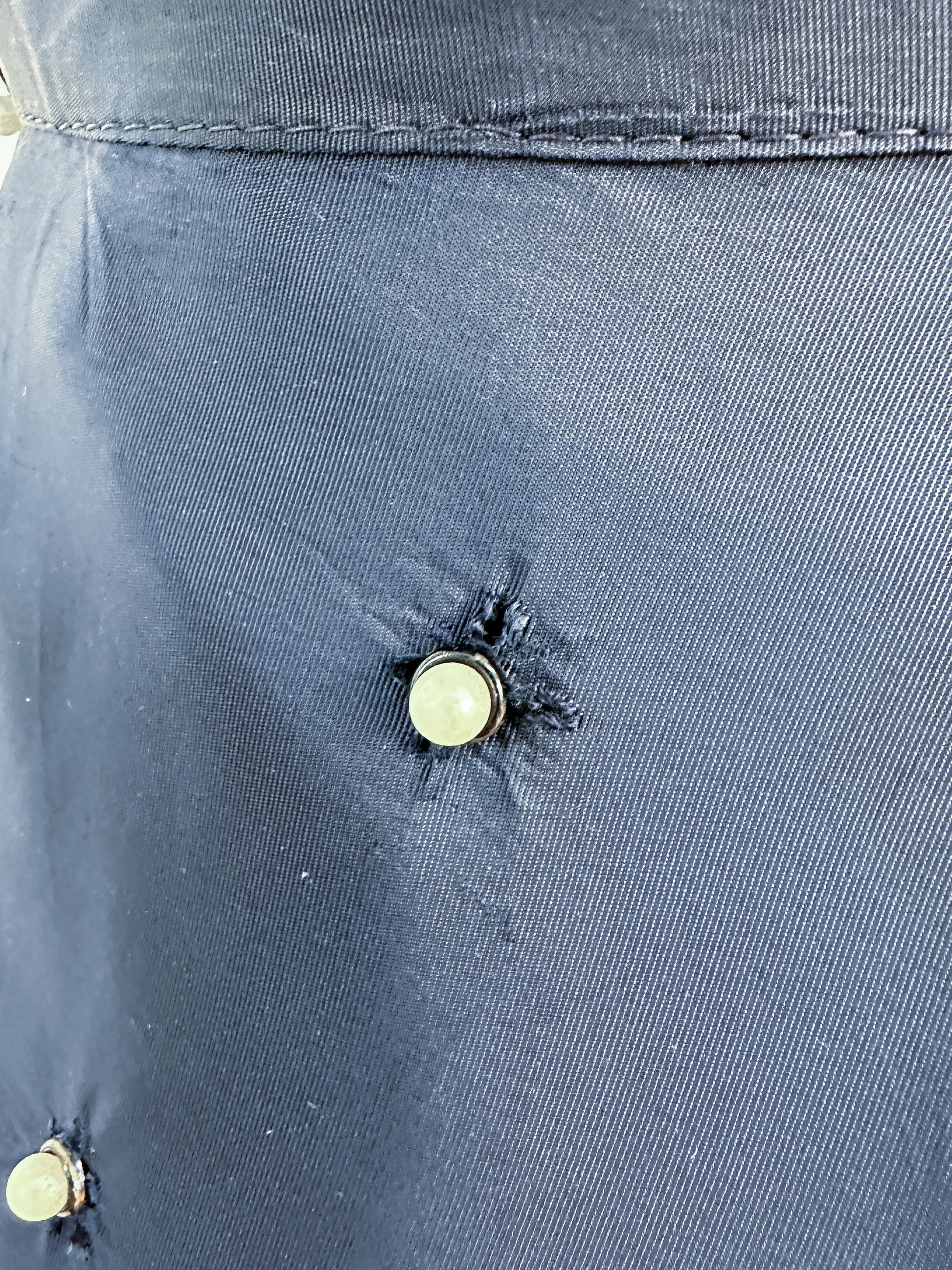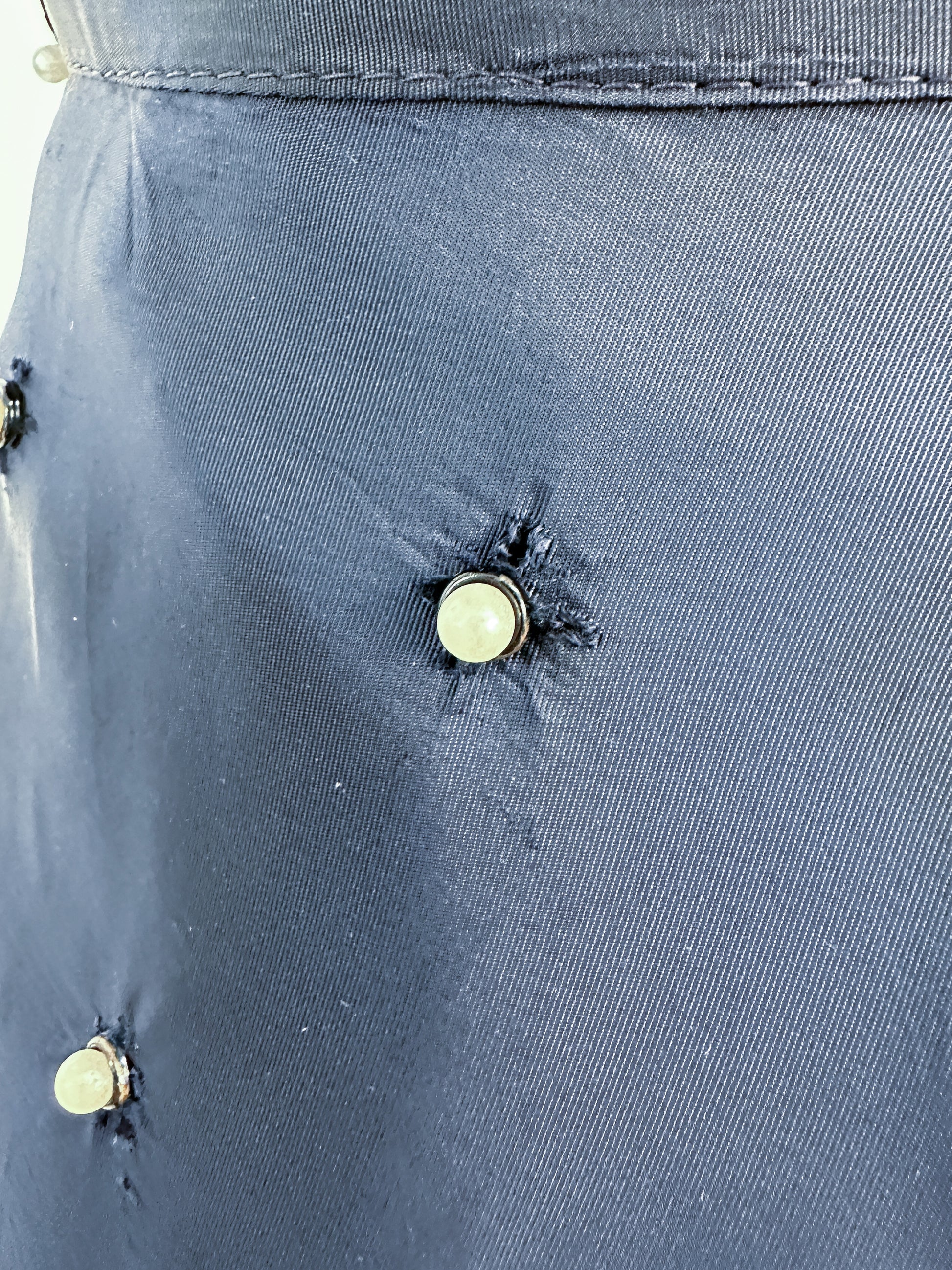 Condition: Great vintage condition, a small patch on the inside of of skirt, not noticeable as it gets lost in the folds. Please see the up-close photos of the grommets that hold the pearls. The 'teeth' of the grommets punctured through the fabric from the back, skirt is not lined. Professionally cleaned and ready to wear!